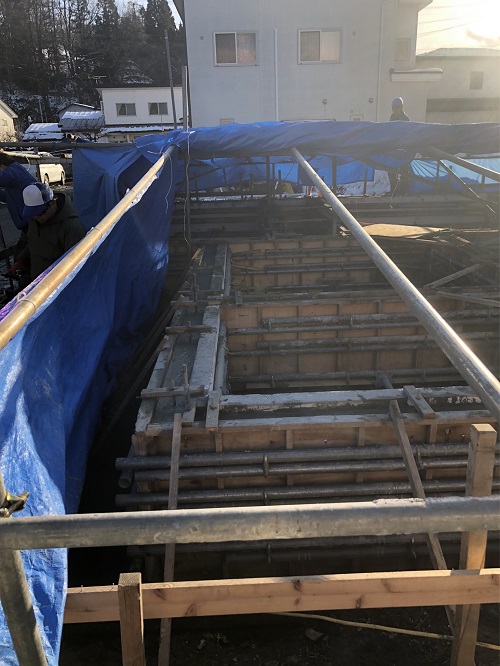 昨日、無事コンクリート打設出来ました。そして、基礎をすっぽりと包み込んで掛けたシートの屋根の下は暖房を焚いて温めて一晩過ごしました。