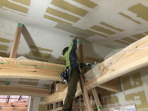 大工間仕切り工事中ですが、内装の天井面のパテ打ちが始まりました。
