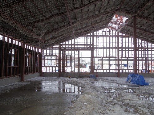 本体工事はダイワハウス様施工ですが、内部の内装や配管類など店舗工事がC工事です。今回はそのC工事を請け負わせて頂きました。土間床に墨打ちをしようと乗り込むと、まだ外部が囲われていなくて、凍り付いた土間面からの雪と氷の除去が工事のスタートでした。