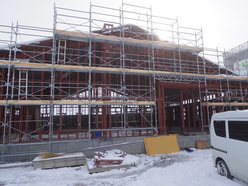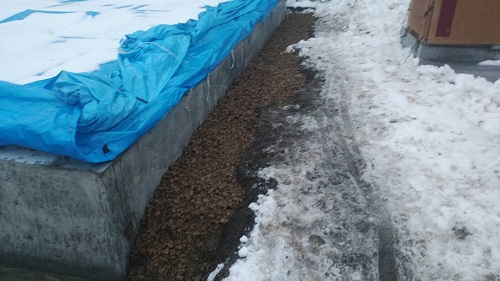 本体工事で妻側上部の三角部がなかなか囲われないので、上部からの雪の浸入で水出しに難儀しています。