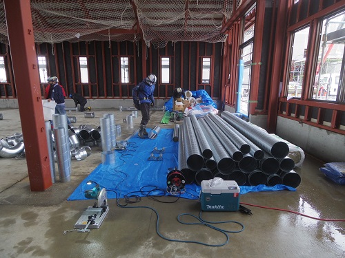 昨日も配管工事が進む脇での水出しを行いましたが、本体工事の外部工事も進んでガラスも入り妻壁も塞がれましたので、これで安心です。