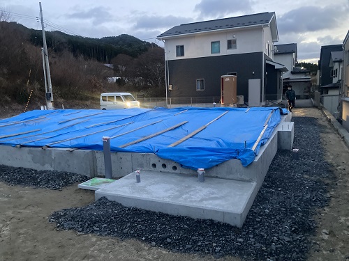 大工の刻み場で打ち合わせ後に現場確認しました。基礎養生が確りと生きていて安心して年越しが出来ます。
