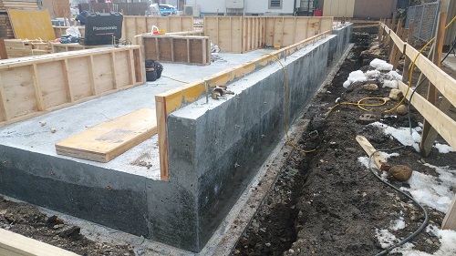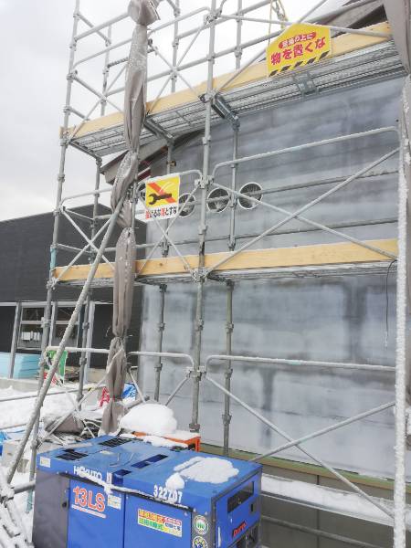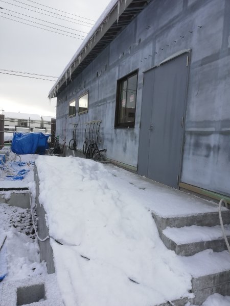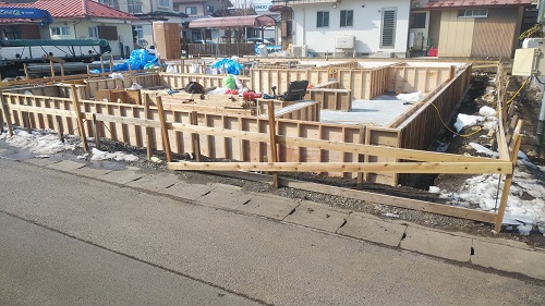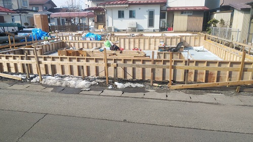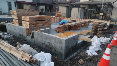 基礎コンクリート無事打設しました。冬場なので、雪囲いの屋根を掛け込んで暖房を焚いて養生しました。