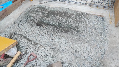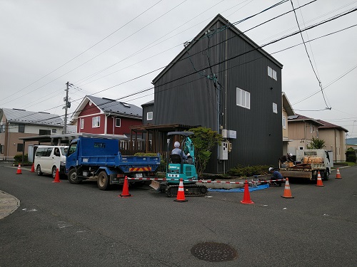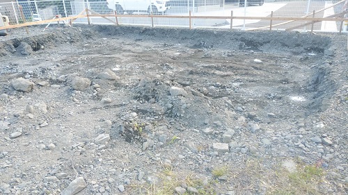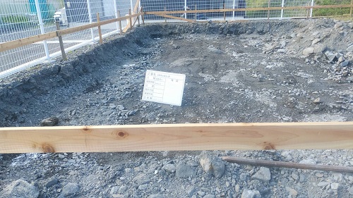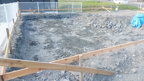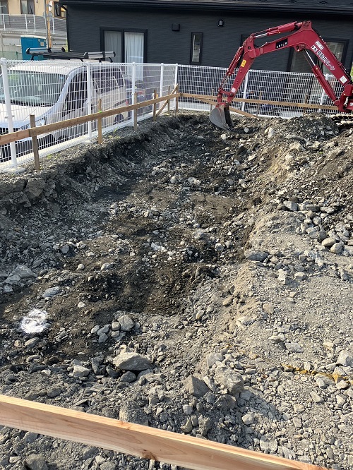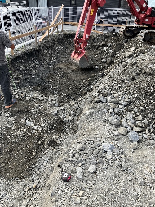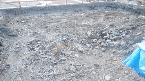 基礎根伐りが進みましたが、川石混じりの埋め立て土に難儀している様です。