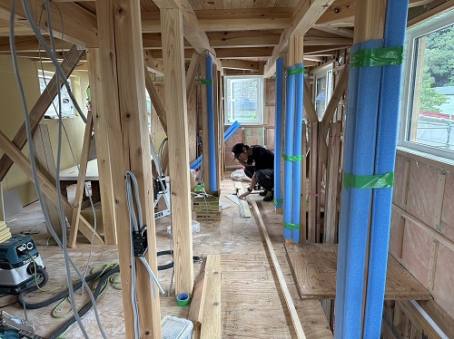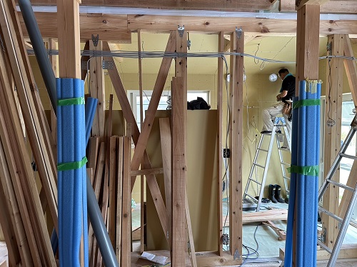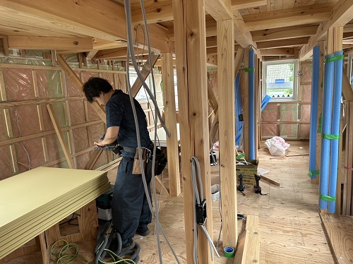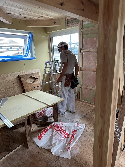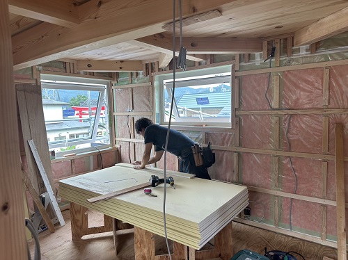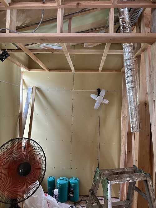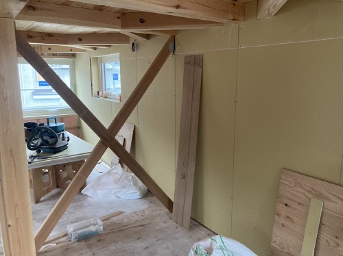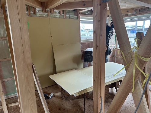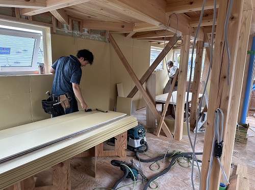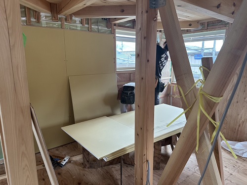 刻みを終えた若手大工メンバーがボード張りの応援に入りました。