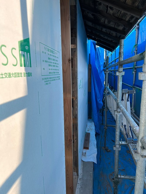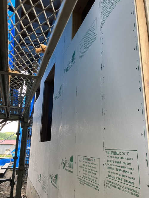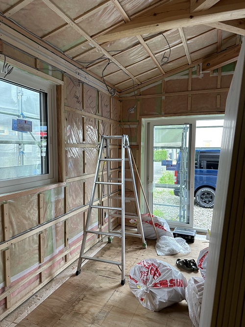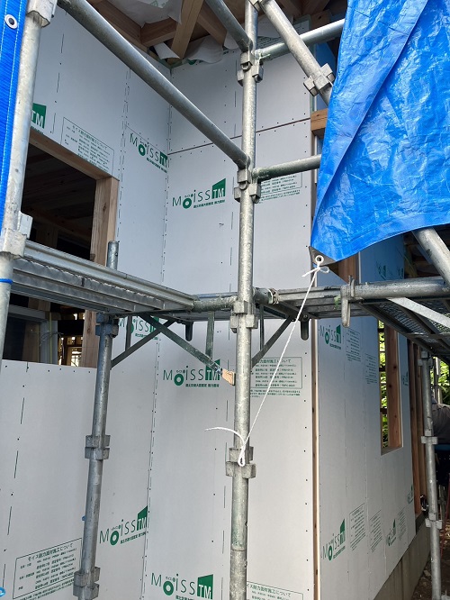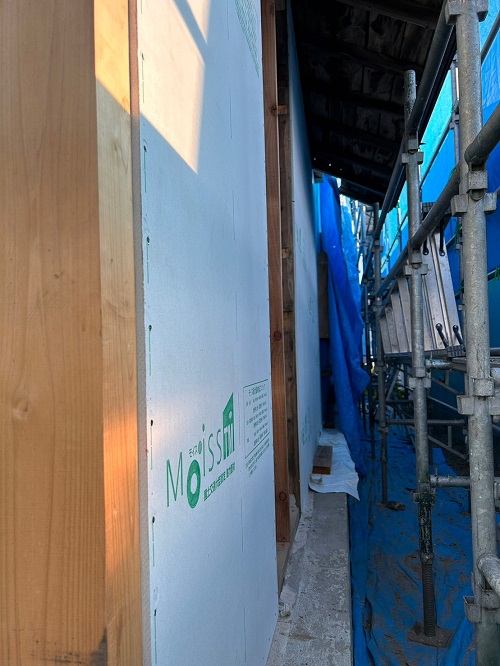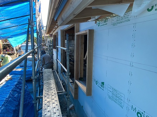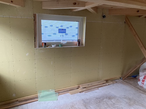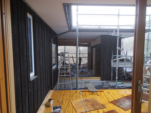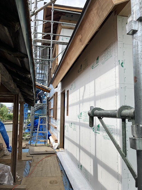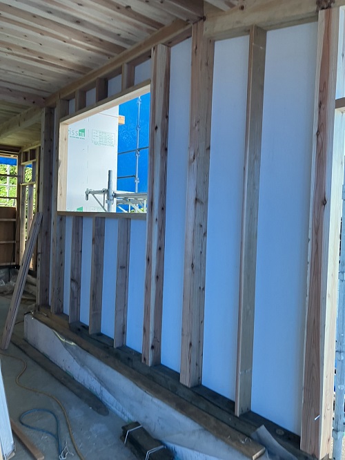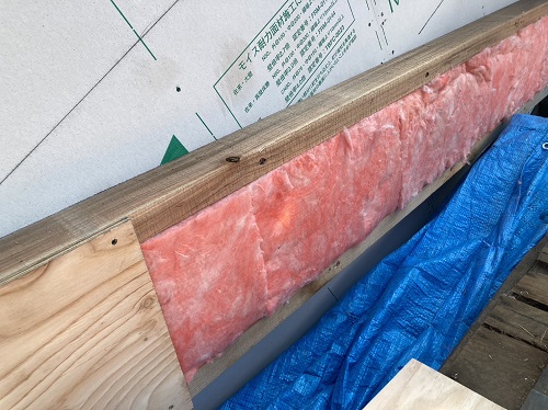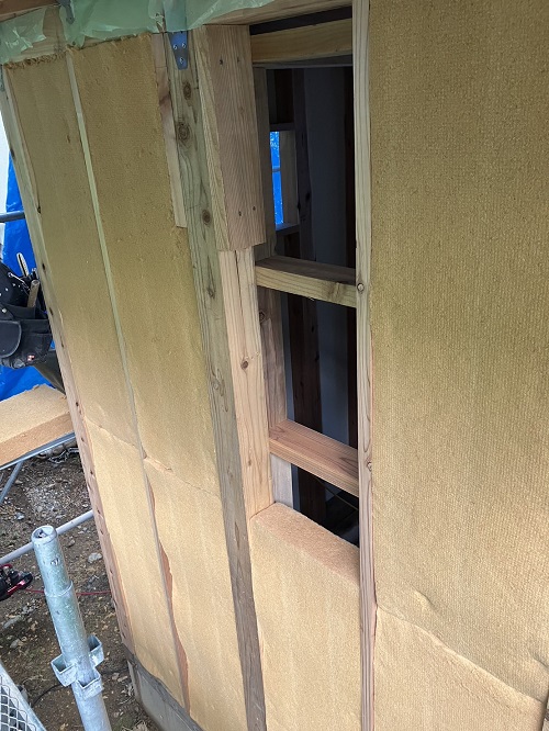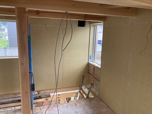 構造面材の張込みと壁断熱の充填も進みました。木繊維断熱です。