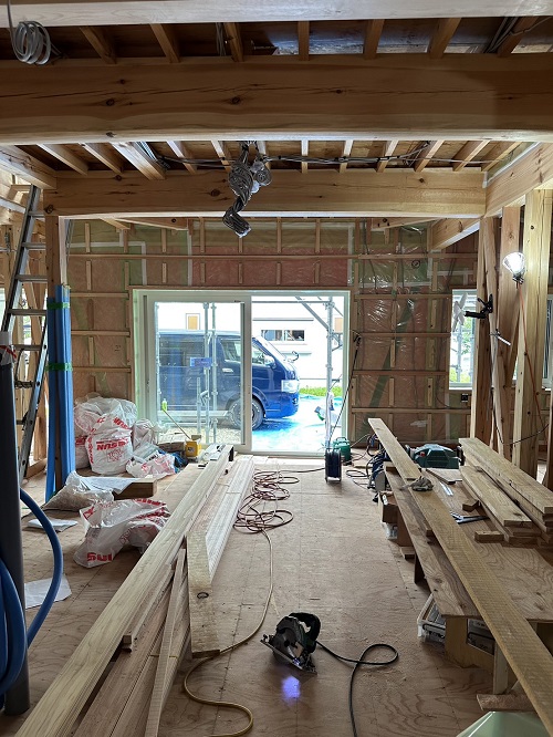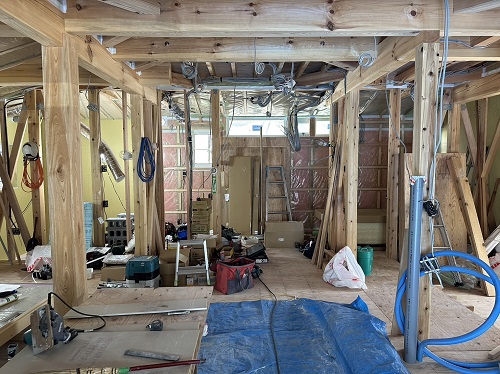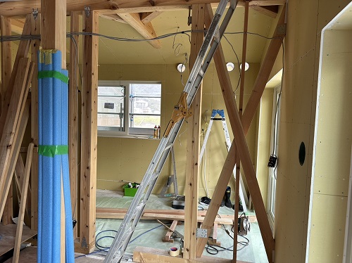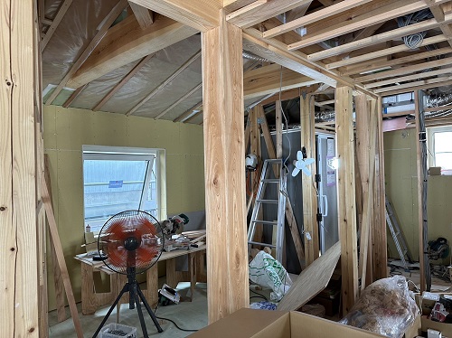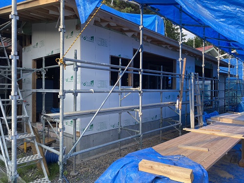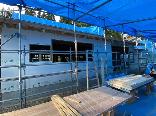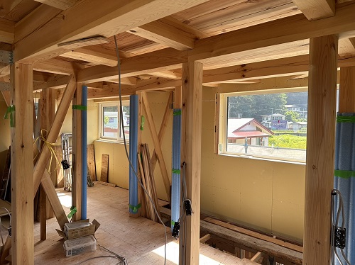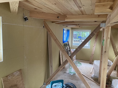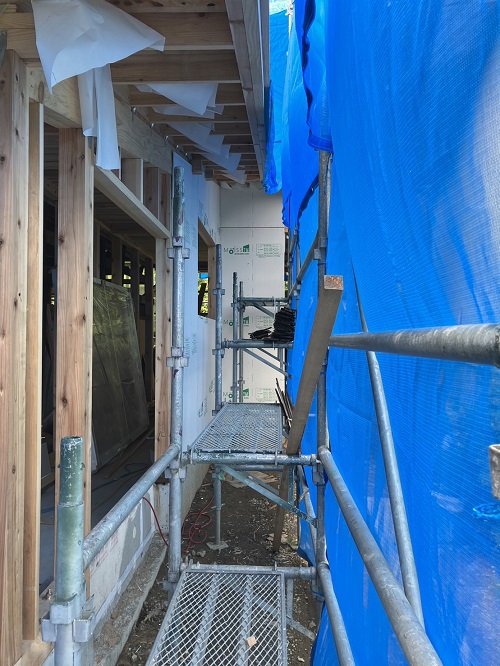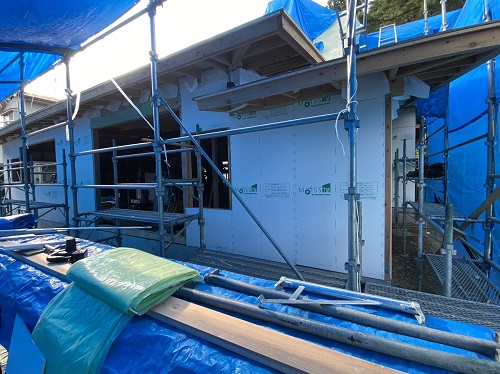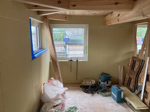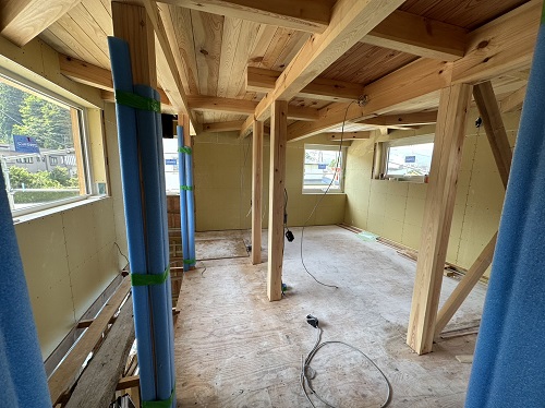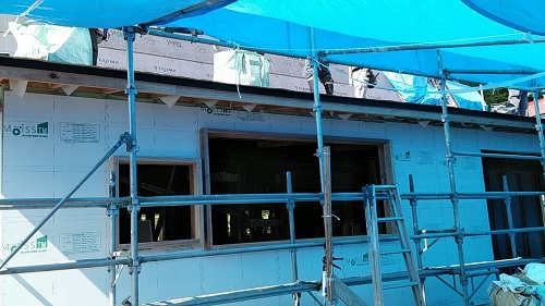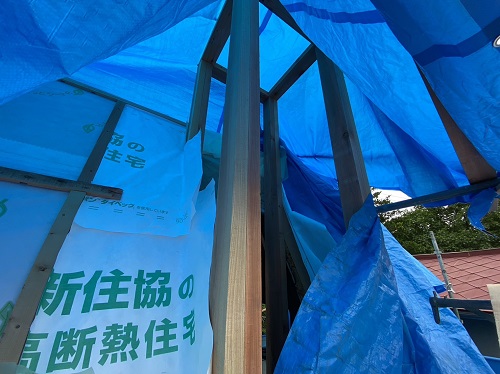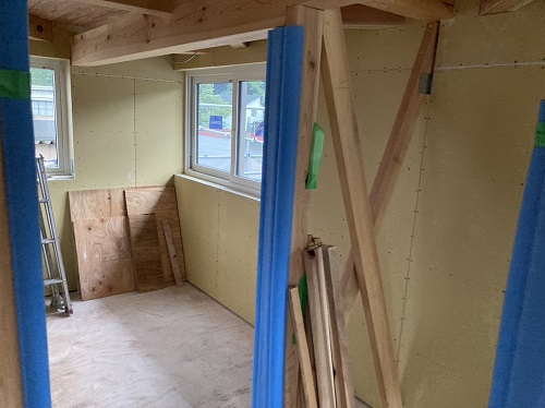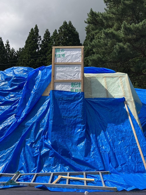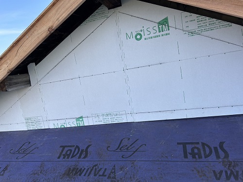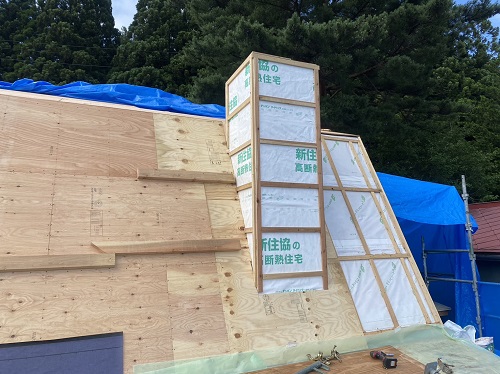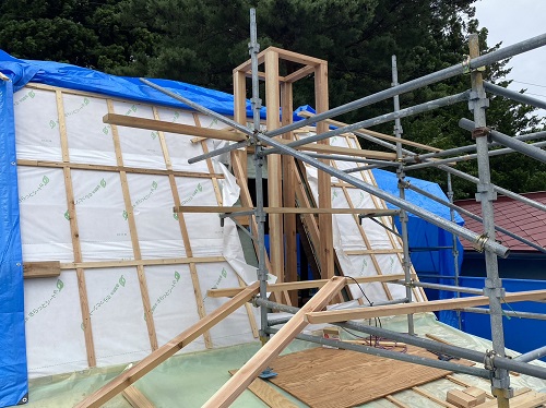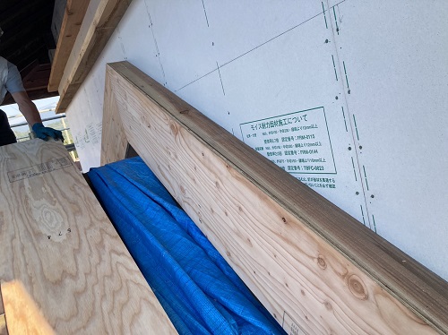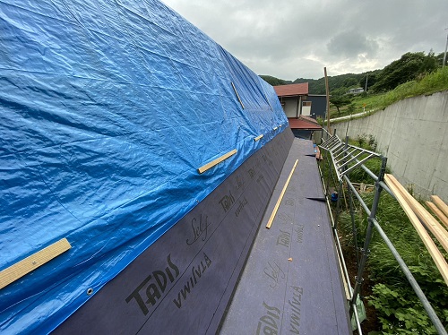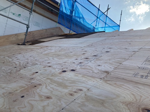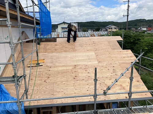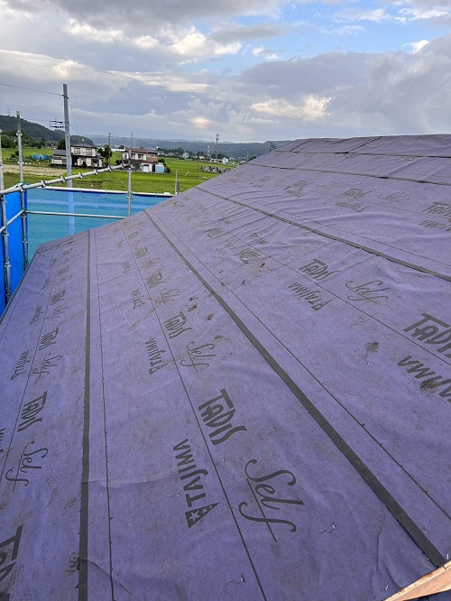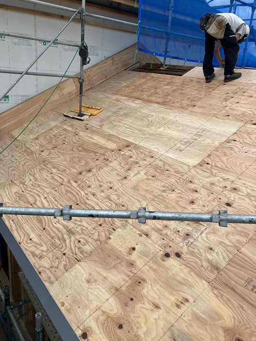 屋根は防水シートが張り込まれました。外周部は構造面材の張込みが進んでいます。