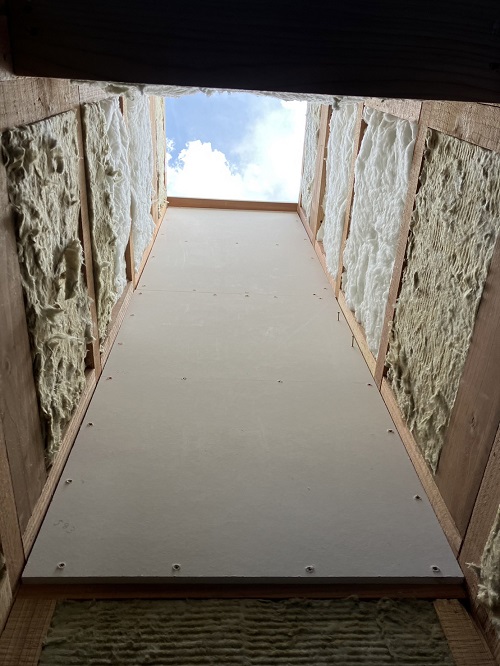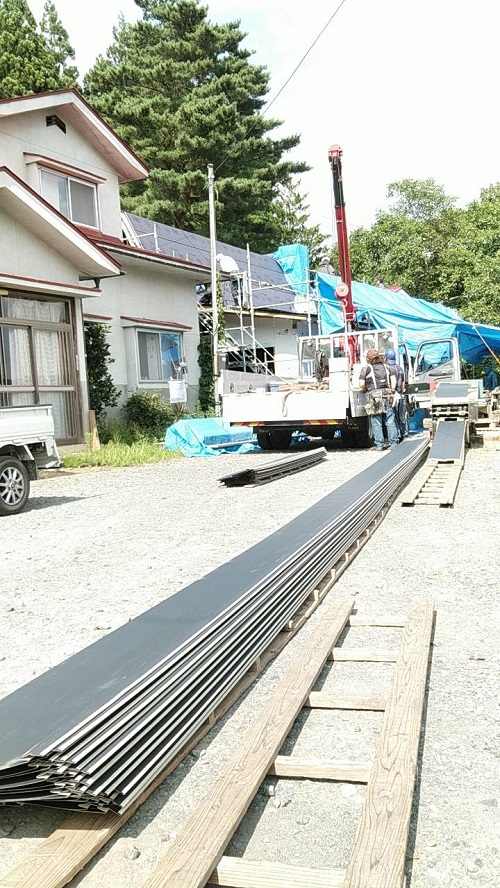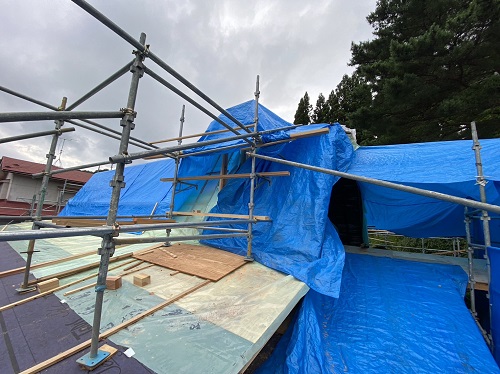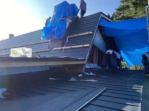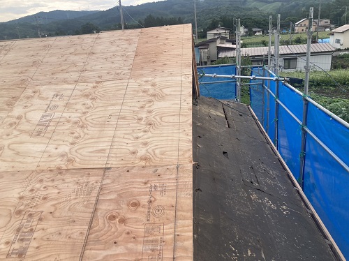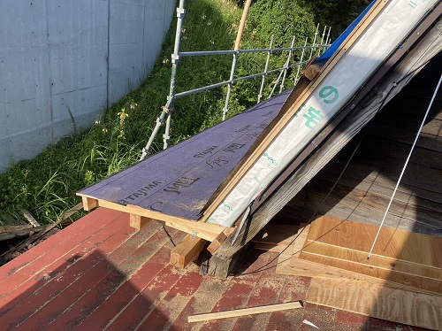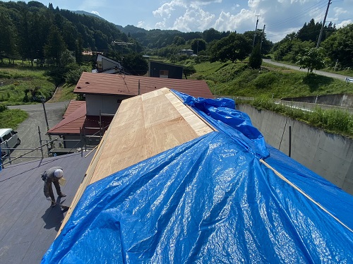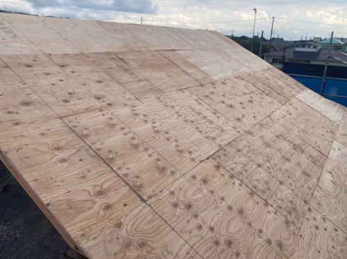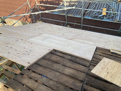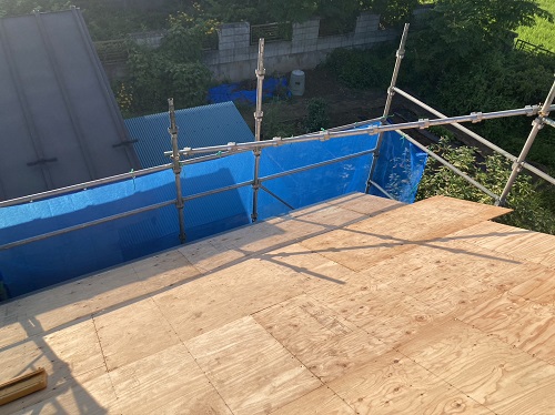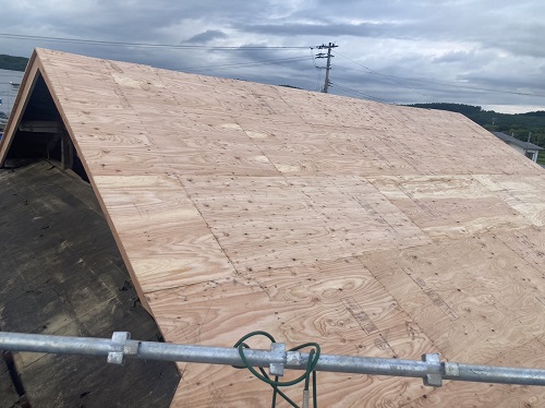 穂さしぶりの晴れ間で屋根板金を剥がして野地合板を張り込みました。