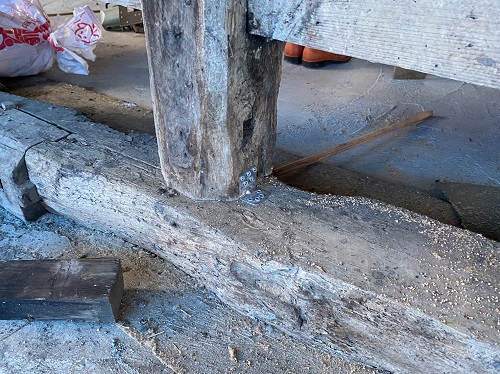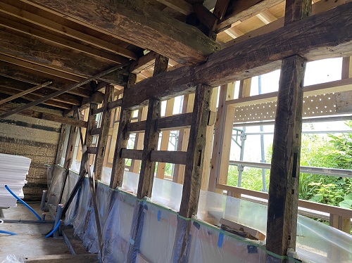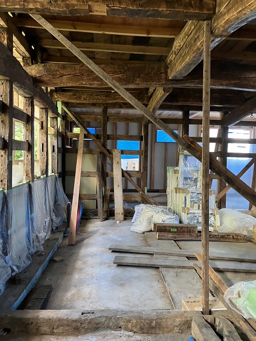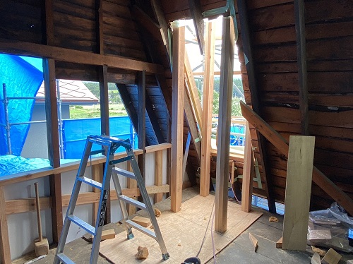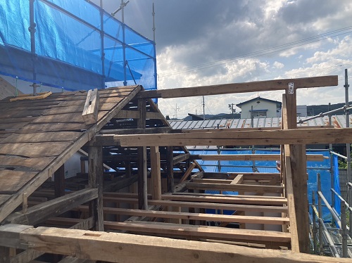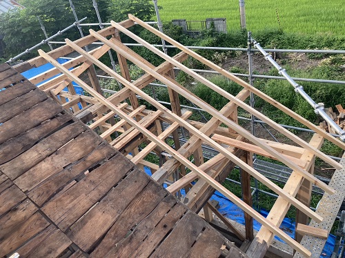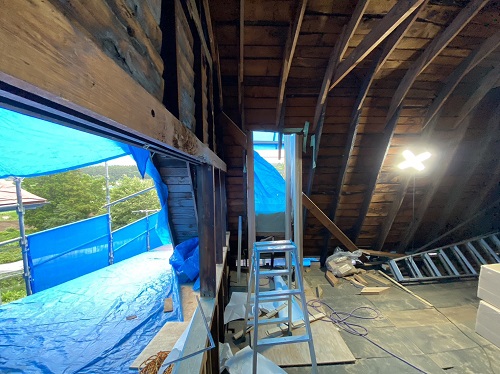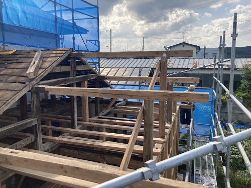 上部の屋根を葺き上げて下屋根の母屋及び垂木掛け直しが進みました。