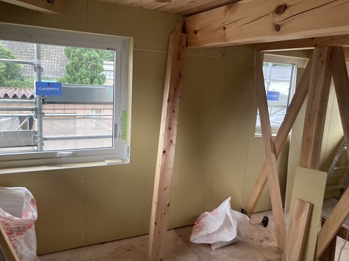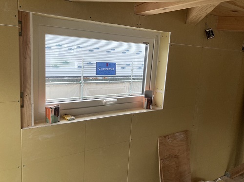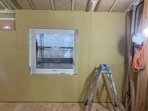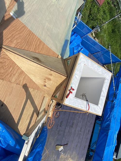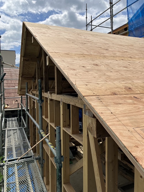 マンサード屋根下地合板張込みが進みました。軒先板金下地も付けて屋根工事待ちです。