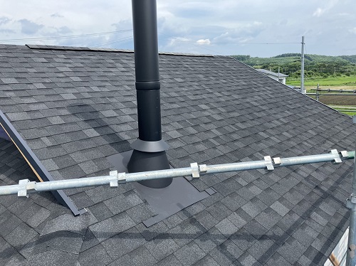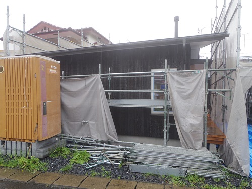マンサード屋根部の煙突工事などが雨を避けながら進んでいます。