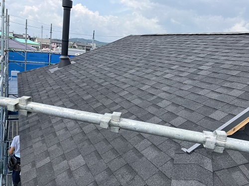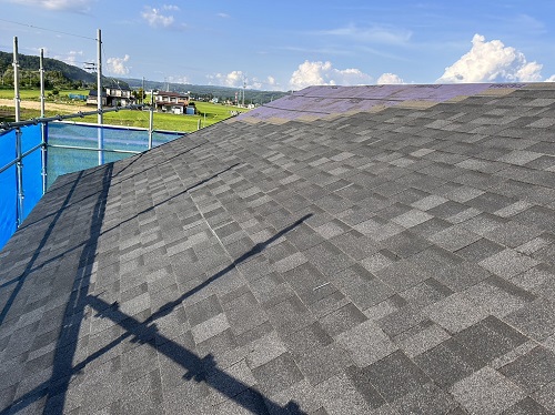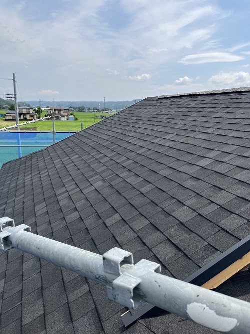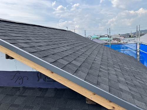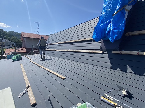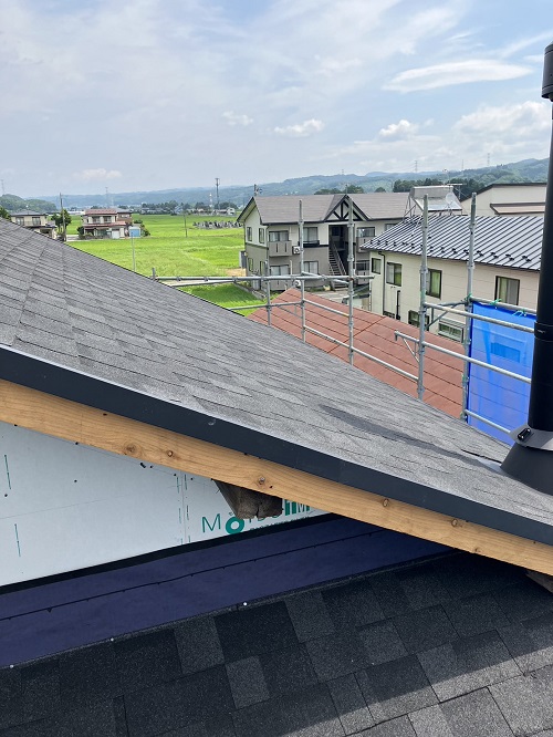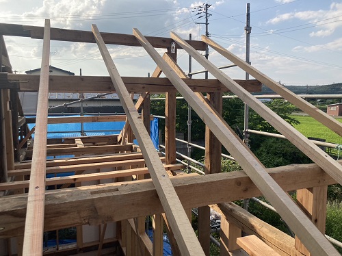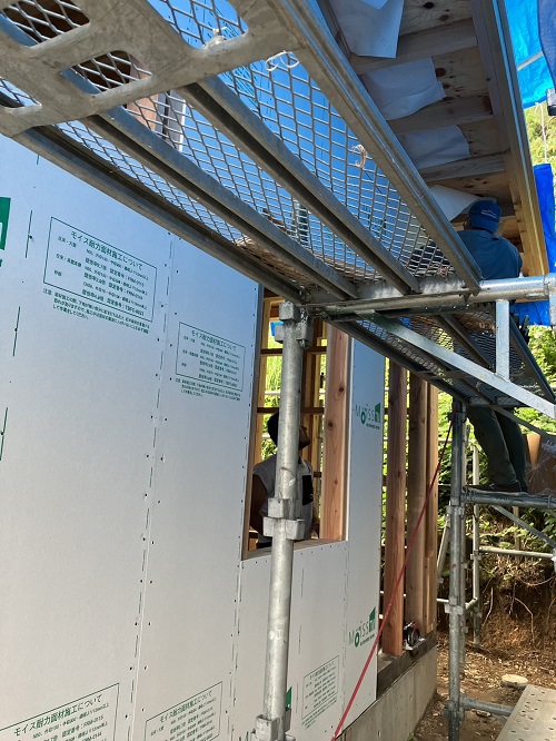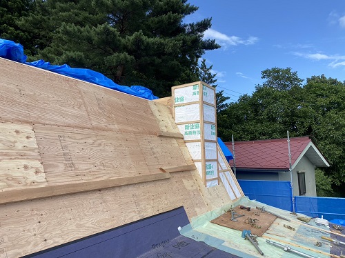 屋根工事が進みました。屋根上はあまりに暑いので、午後は外壁の構造面材張りの方を進めています。