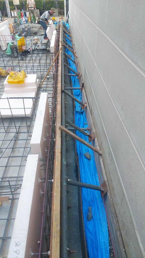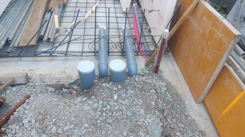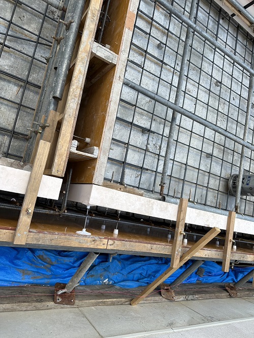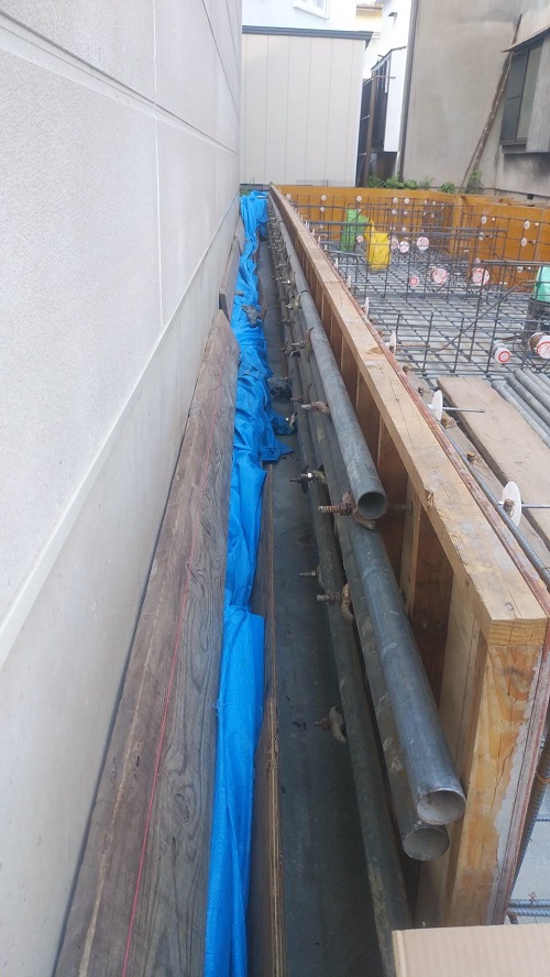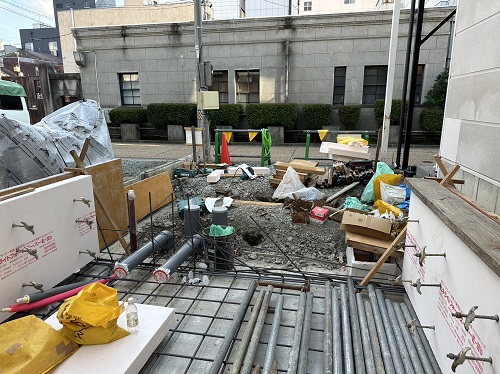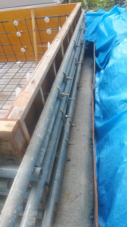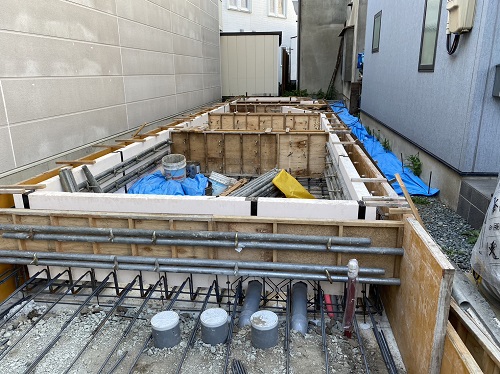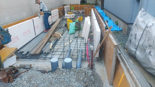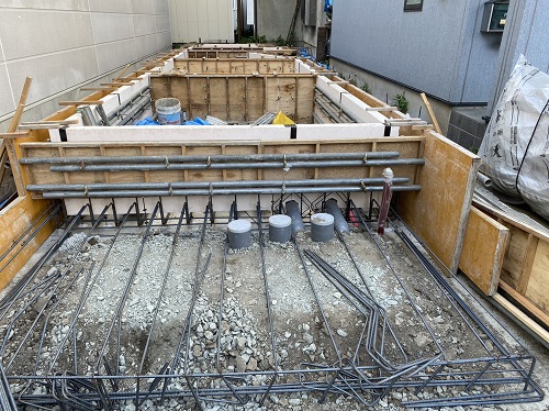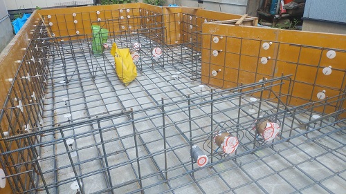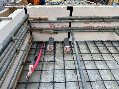 基礎配筋が進み型枠の固めと配管スリーブ取り付けも進みました。
