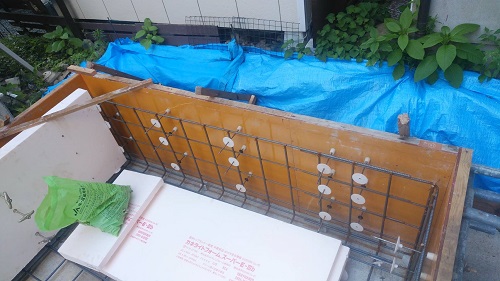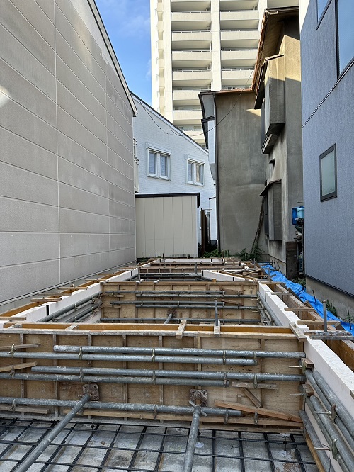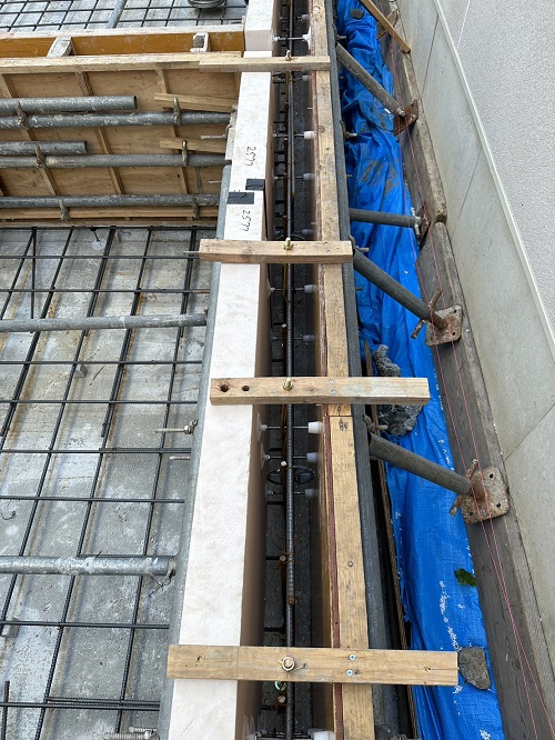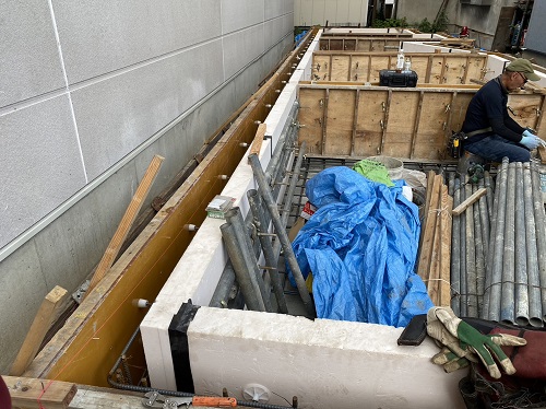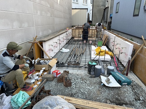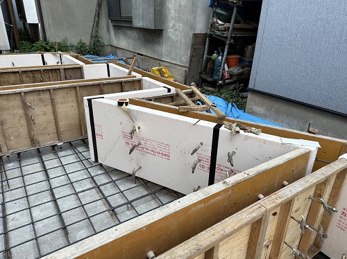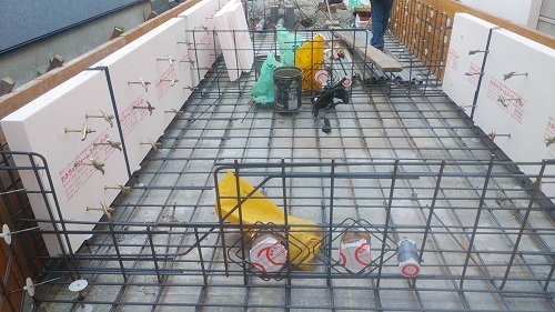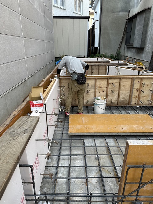 配筋完了して断熱枠類の取り付けに取り組んでいました。