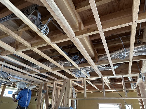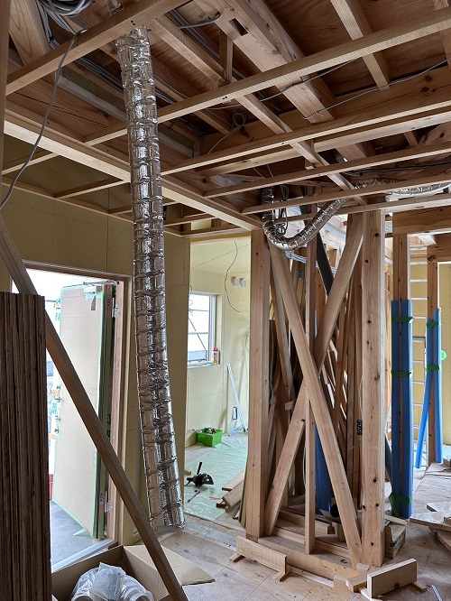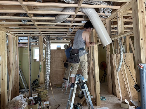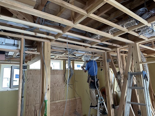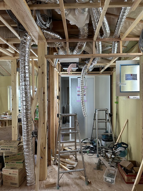 天井下地を組んで、換気配管が取り組まれました。
