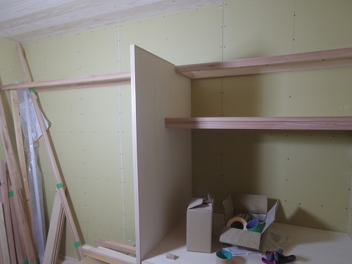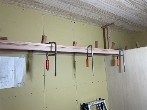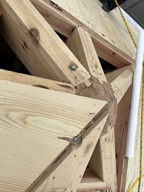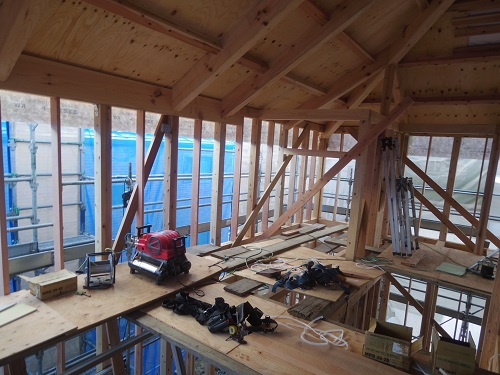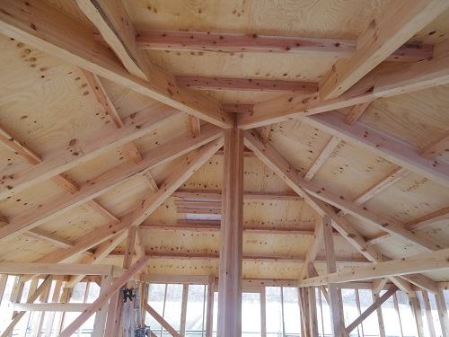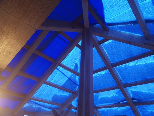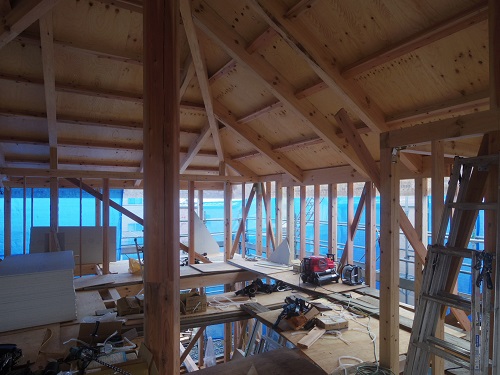 やっと天気が良くって屋根の水平構面合板を張り込みました。