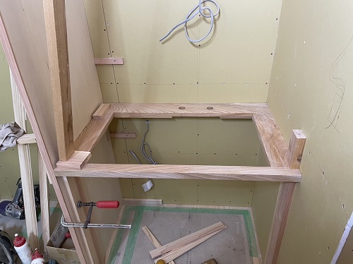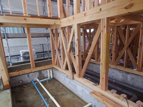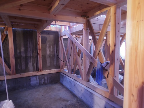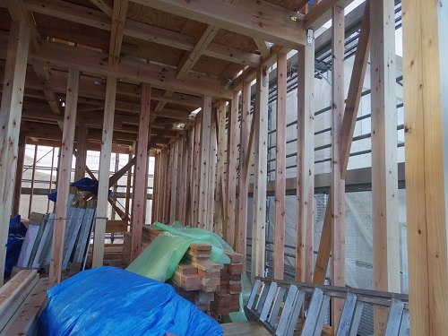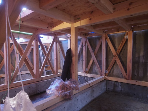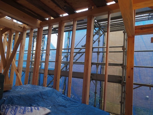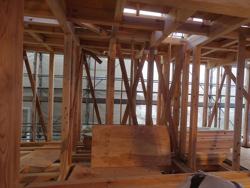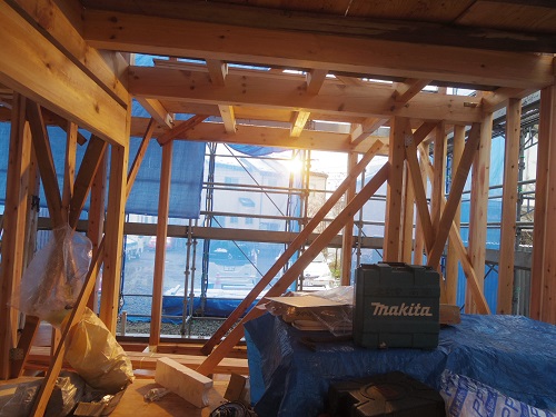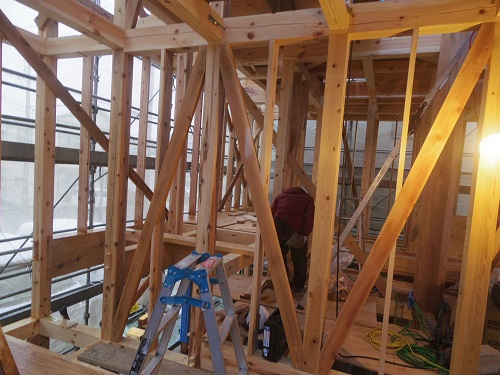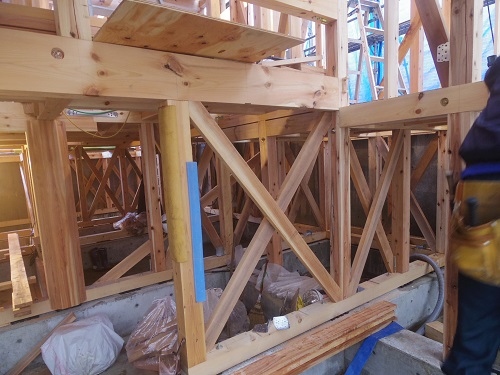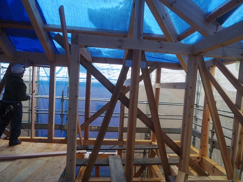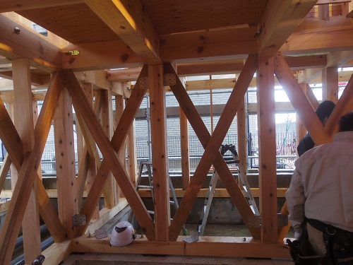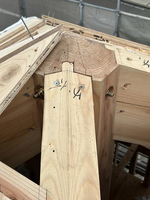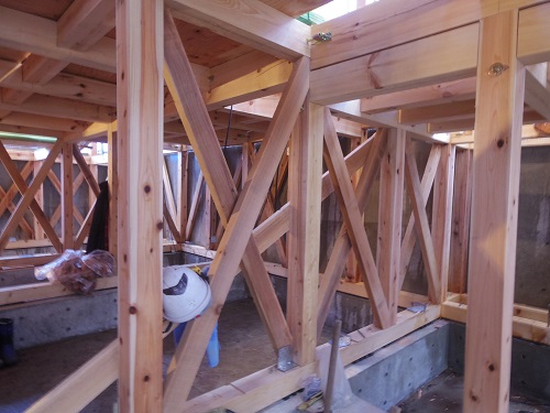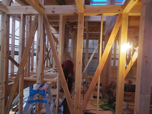上棟後の悪天候で屋根側の工事が出来ないので、間直ししながら金物の取り付けと筋違の取り付けを進めていました。