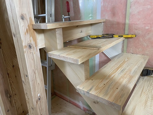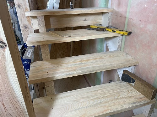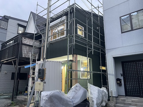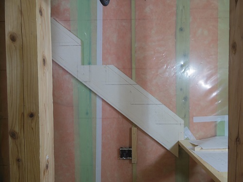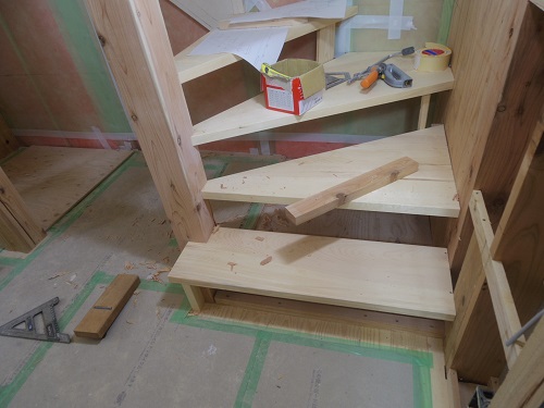 階段や大工造作が進み外壁工事は何とか完了しました。狭いだけでなく天気にも泣かされてしまいましたね。