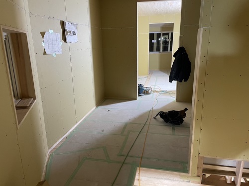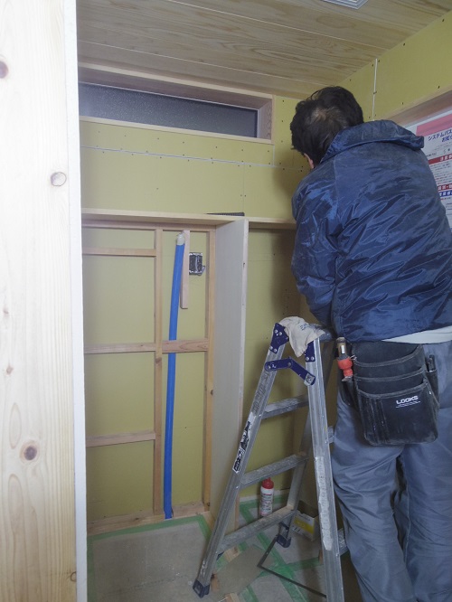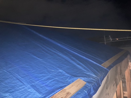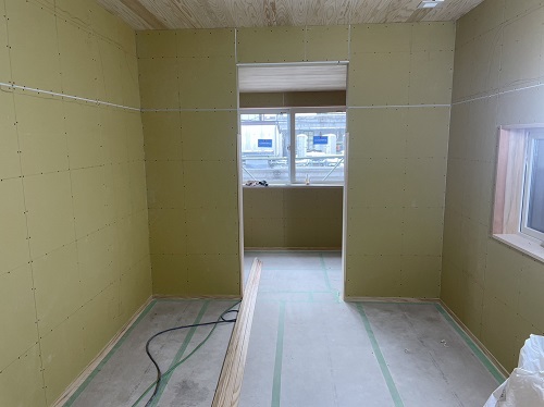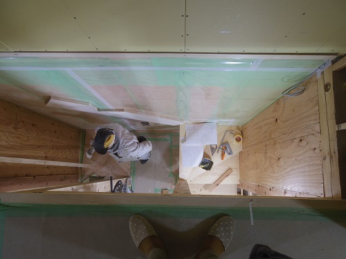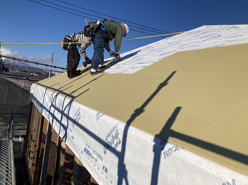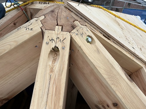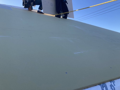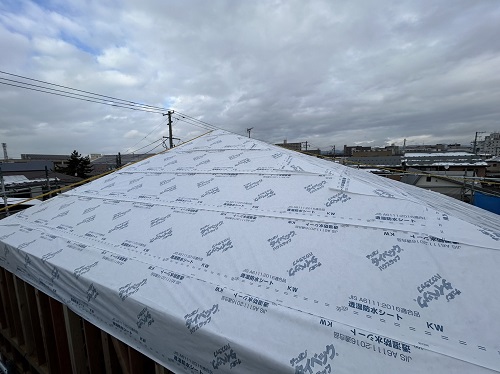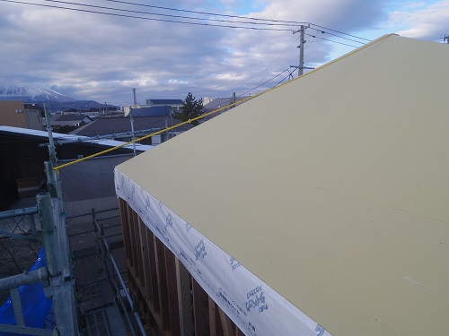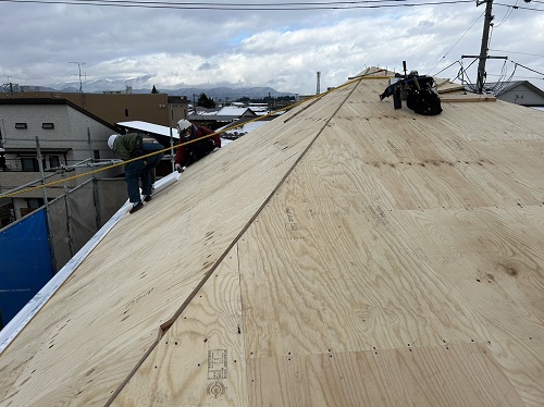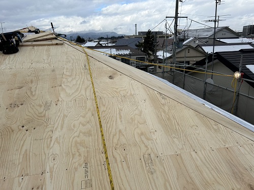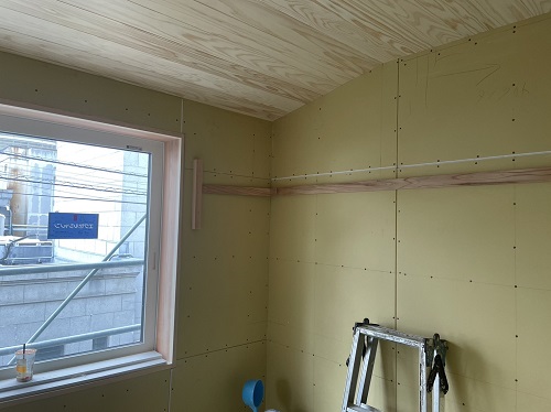 木造三階建ての防火構造規定による屋根の防火PBを張り込んでいます。それが出来てからの屋根垂木工事へと進みます。