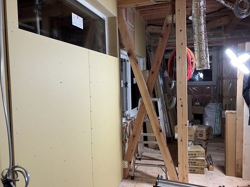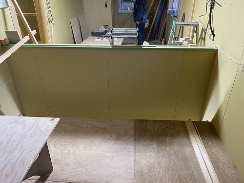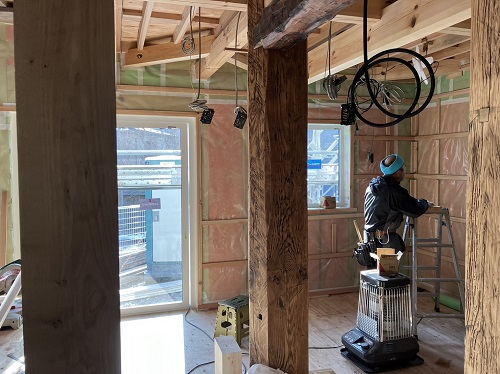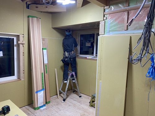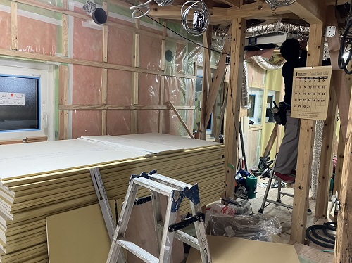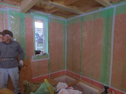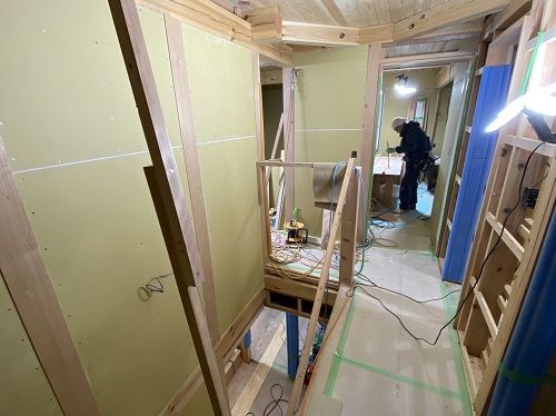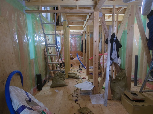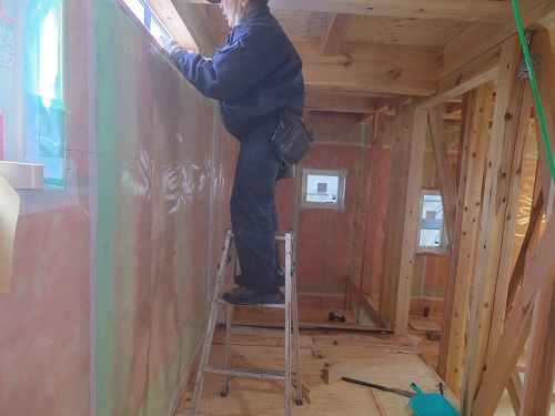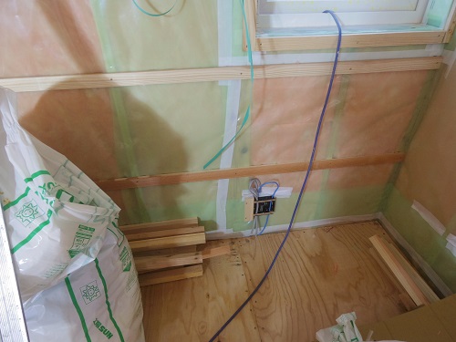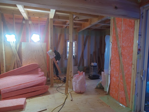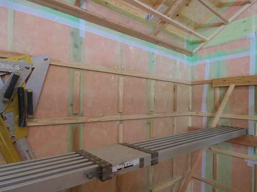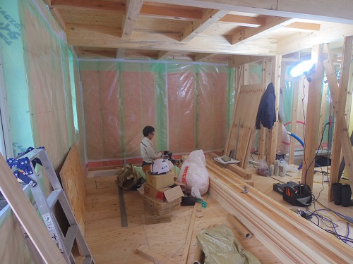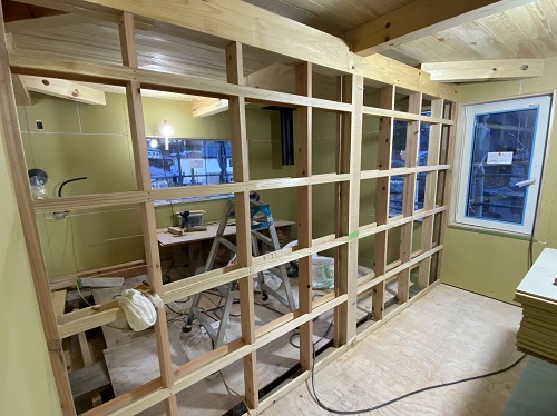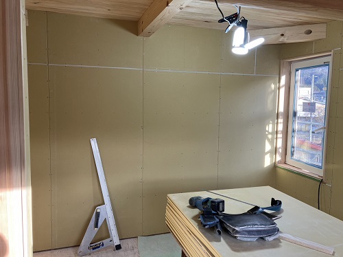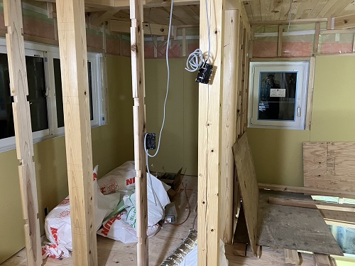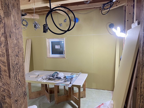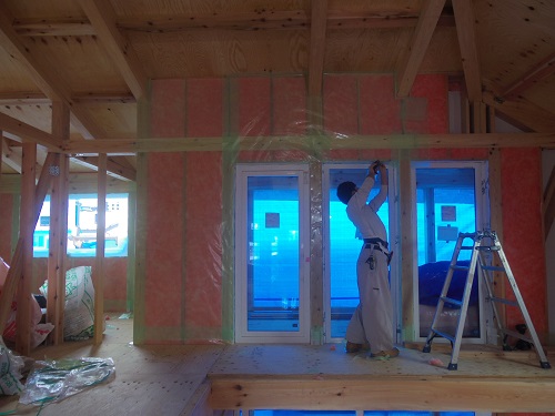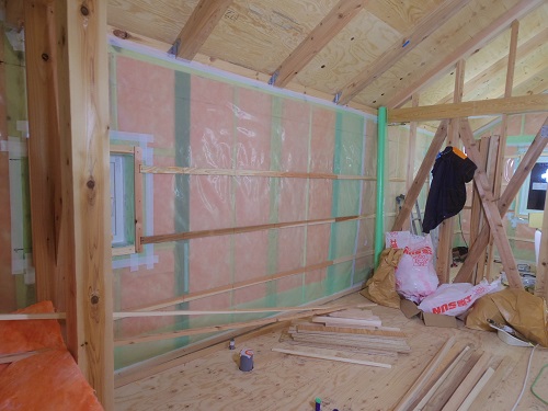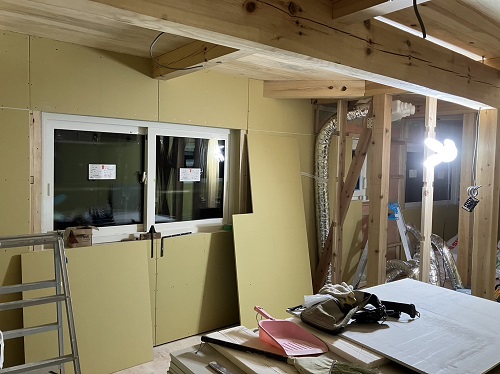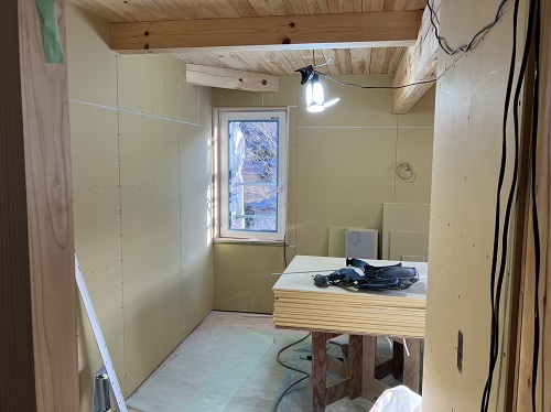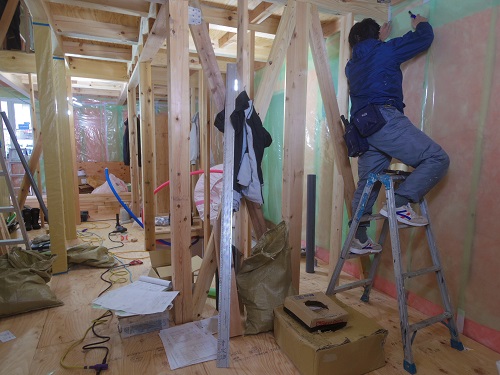 新年を迎えての現場作業は昨年の続きで防湿工事とボード下地の取り付け及び電気配線です。