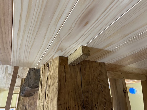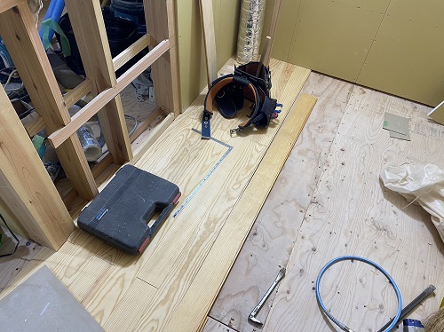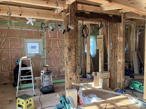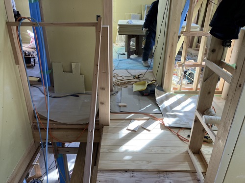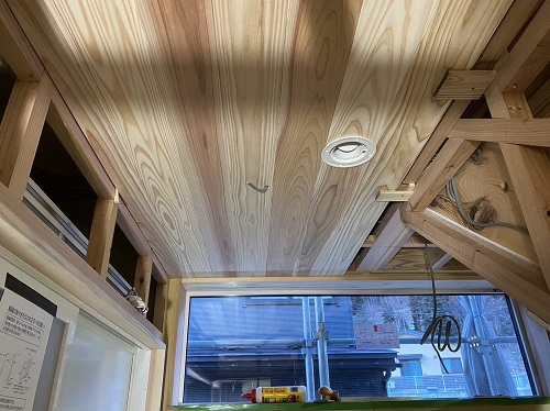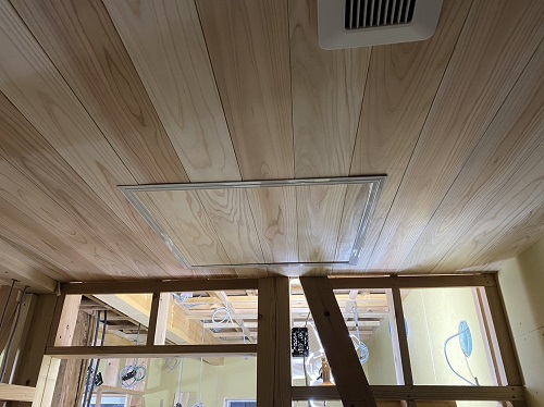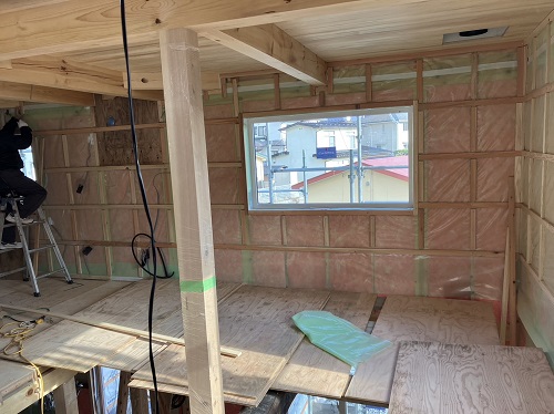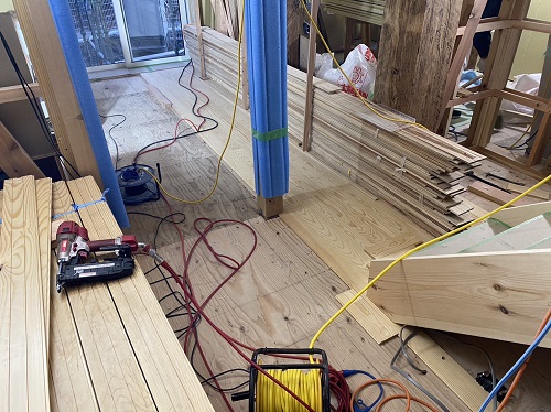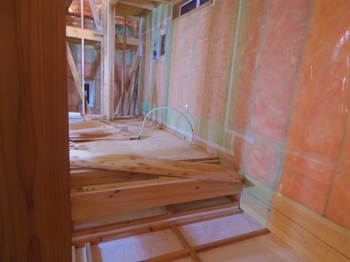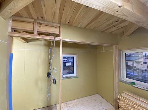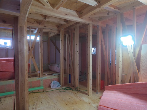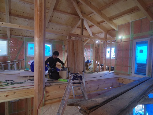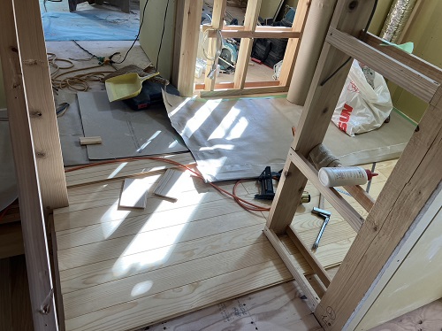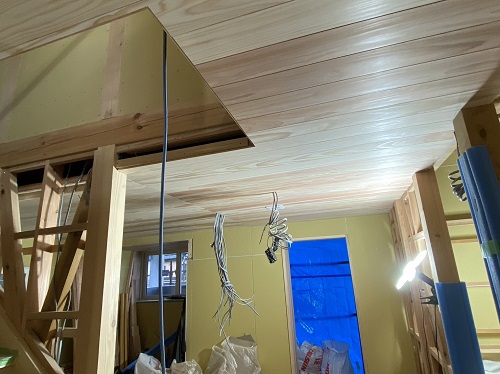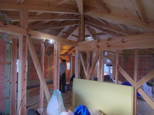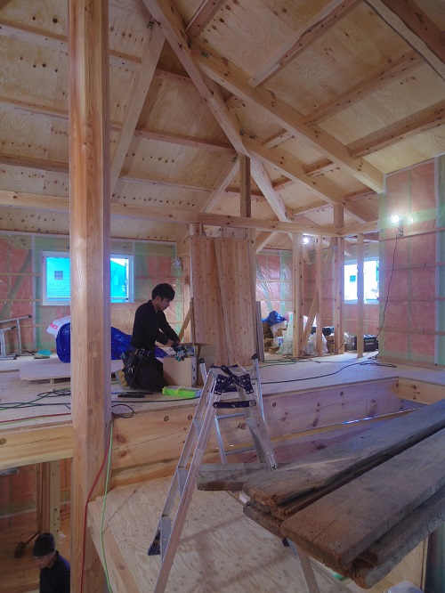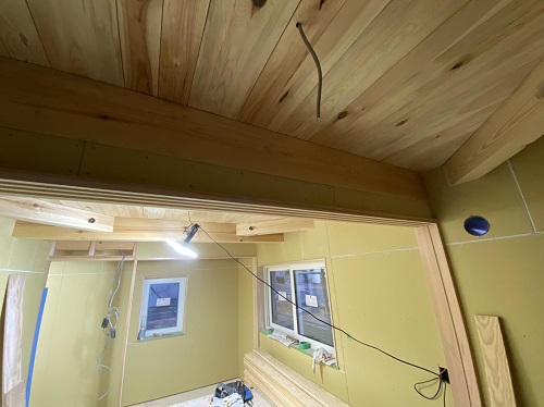 赤松床の張込みと天井杉板張りも進んで来ました。間仕切り壁の下地も同時進行中です。玄関の土間コンクリート打設も進みました。