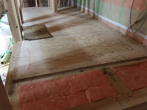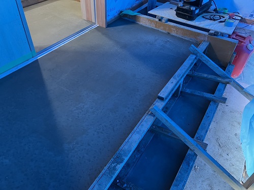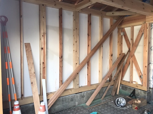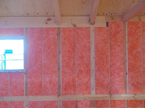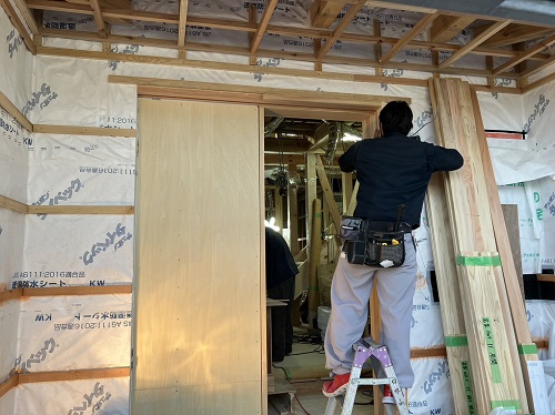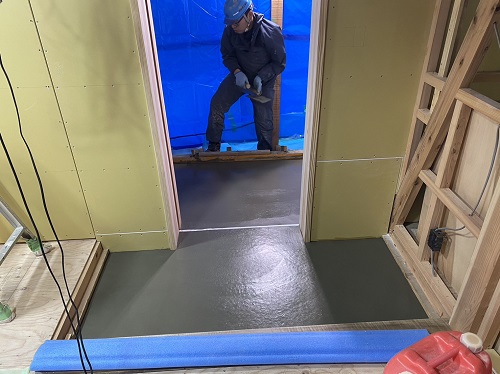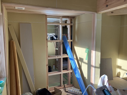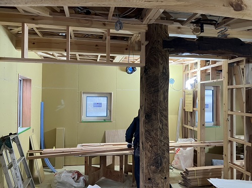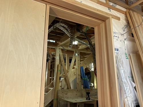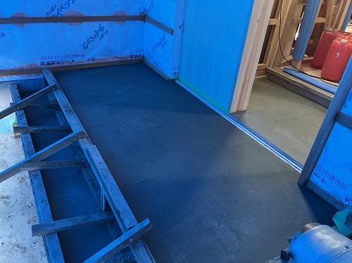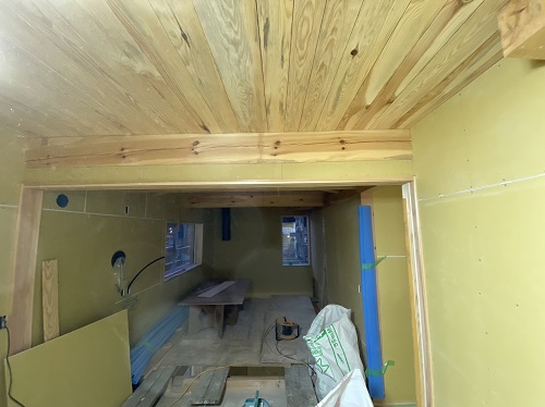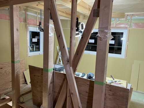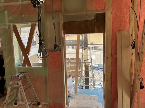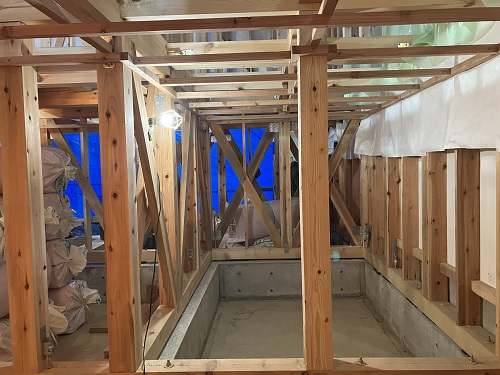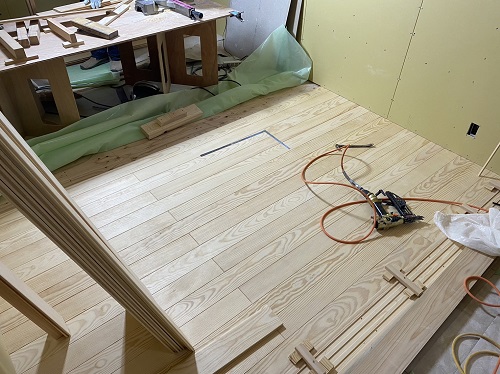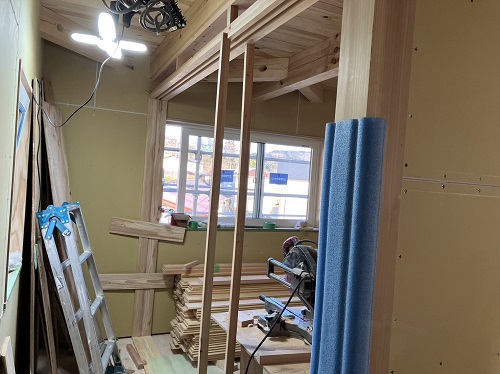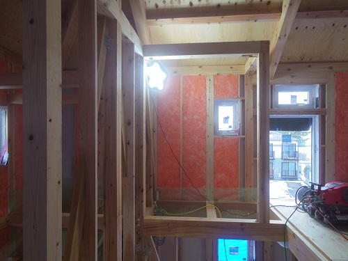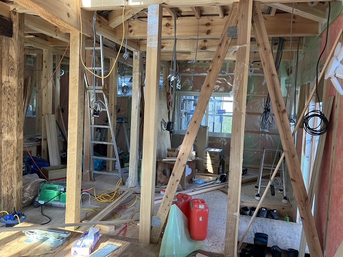 赤松床の張込みと天井杉板張りも進んで来ました。間仕切り壁の下地も同時進行中です。玄関の土間コンクリート打設も進みました。