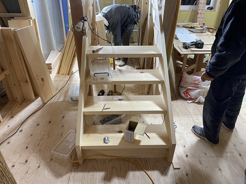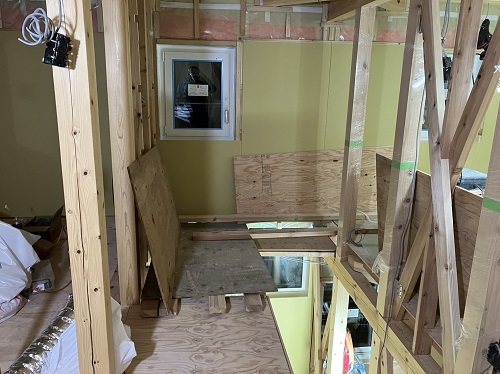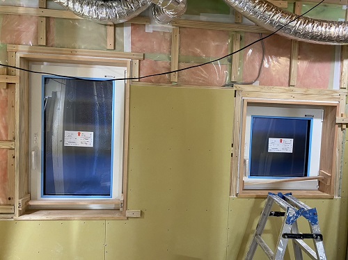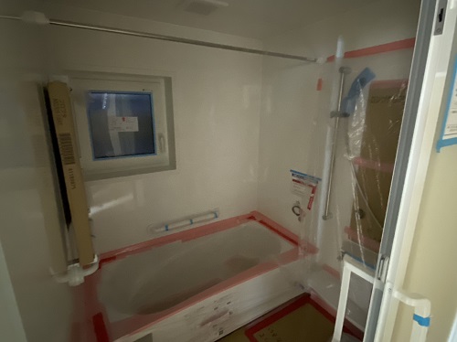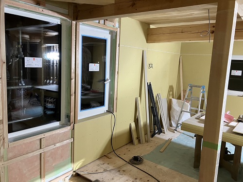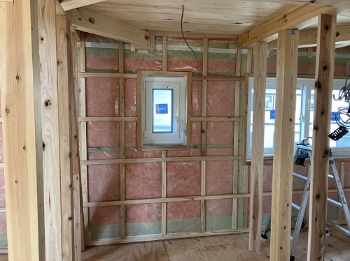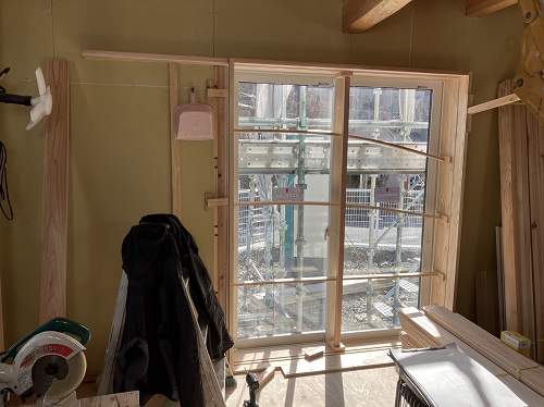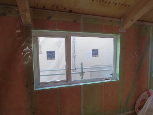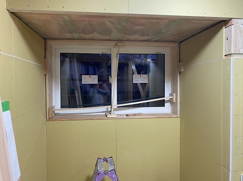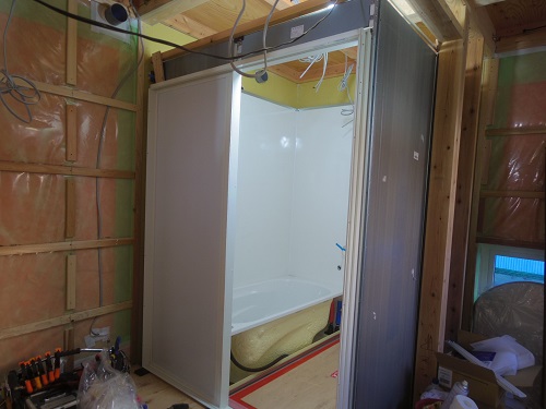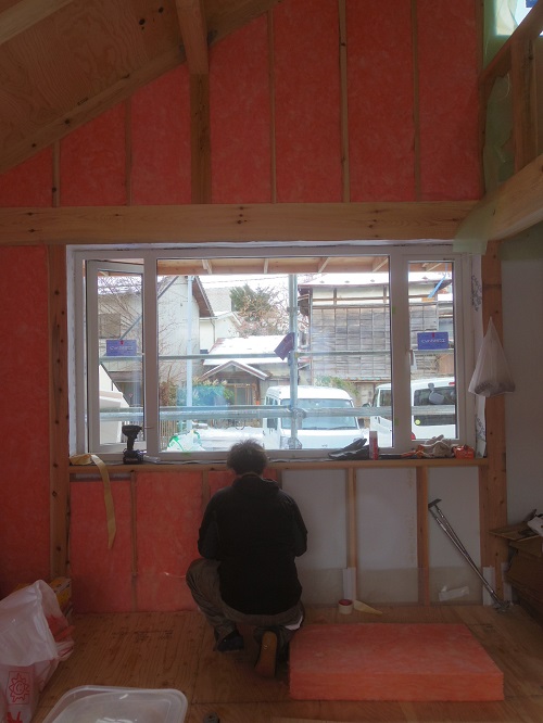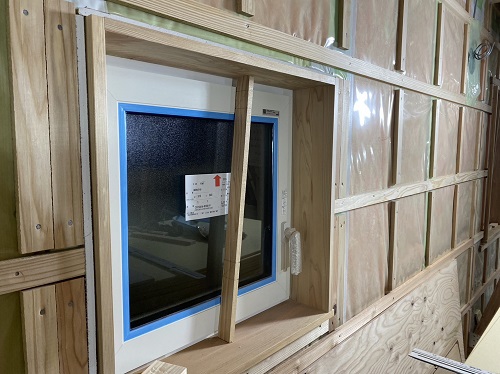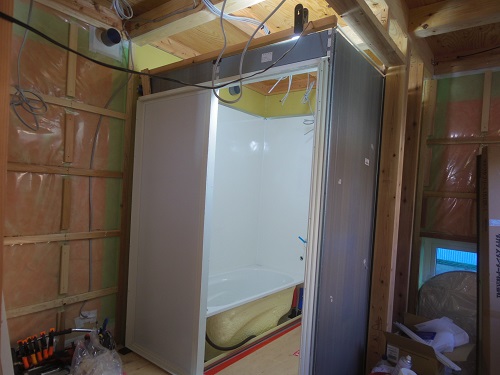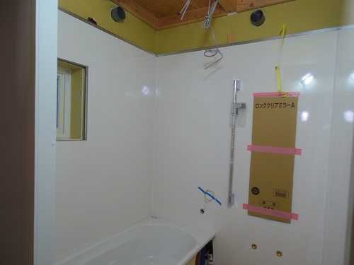 ユニットバスの取り付けも進みました。窓枠工事も進んでいます。窓台は珍しきシデの木です。
