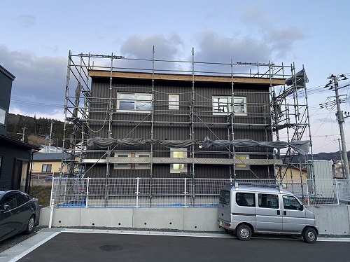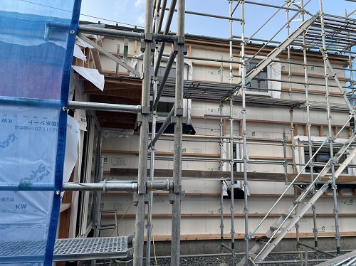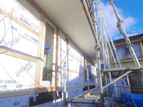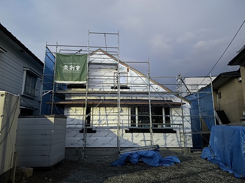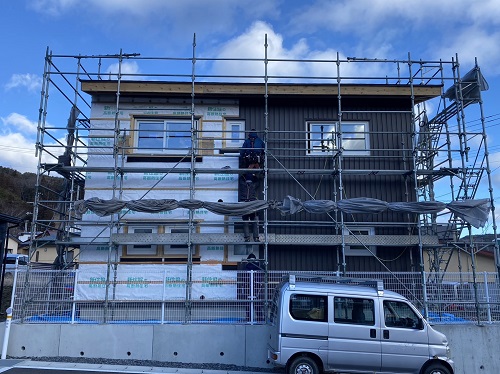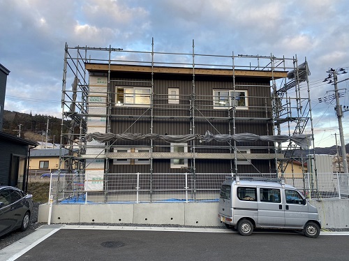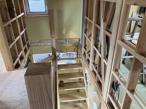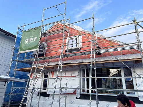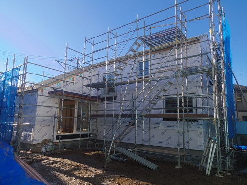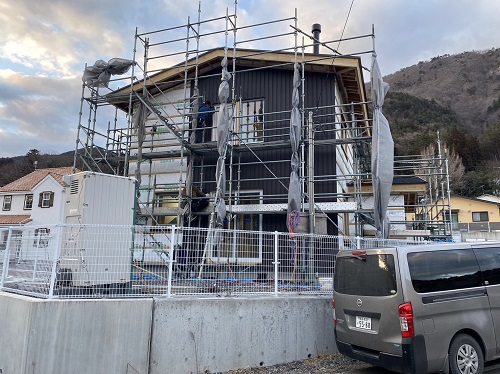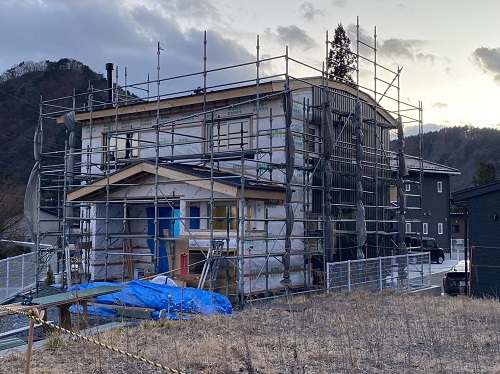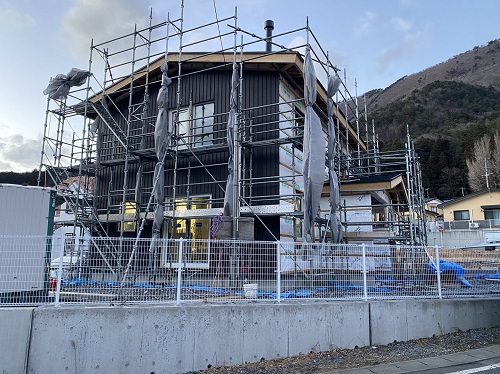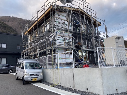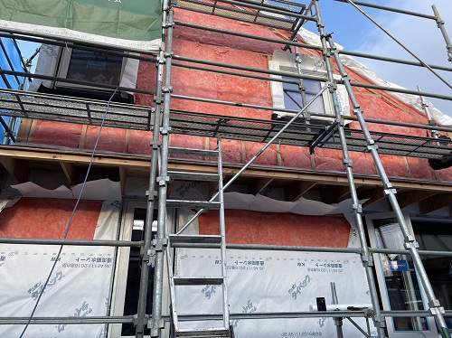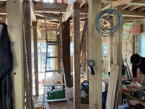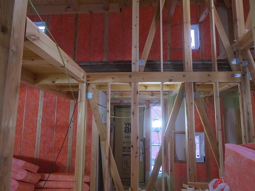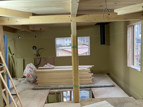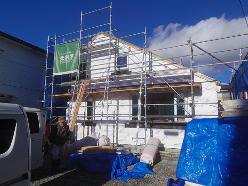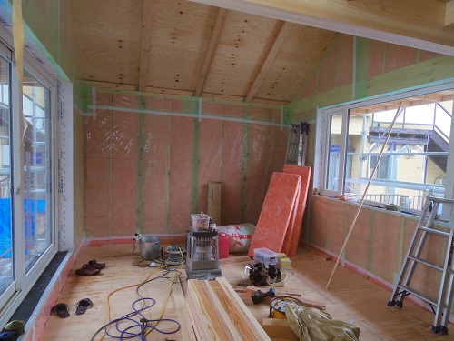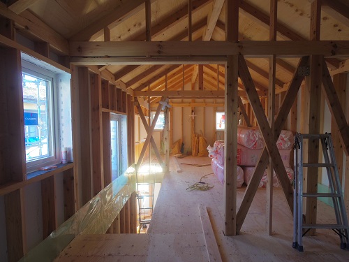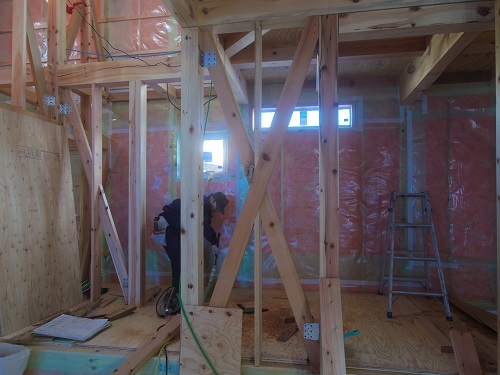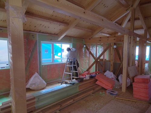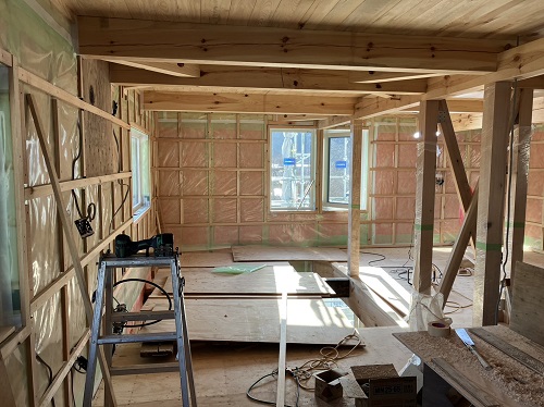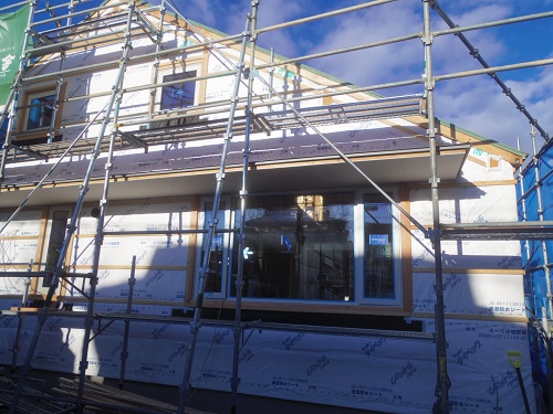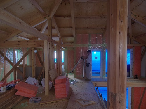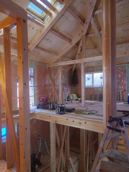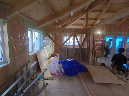 外壁が進み今週末で大方の予定です。内部は天井と床が進み現在は1階の床張込みが取り組まれております。