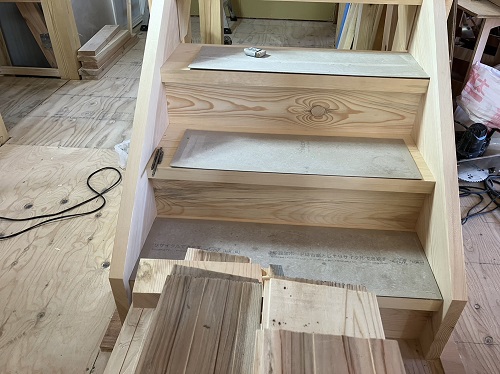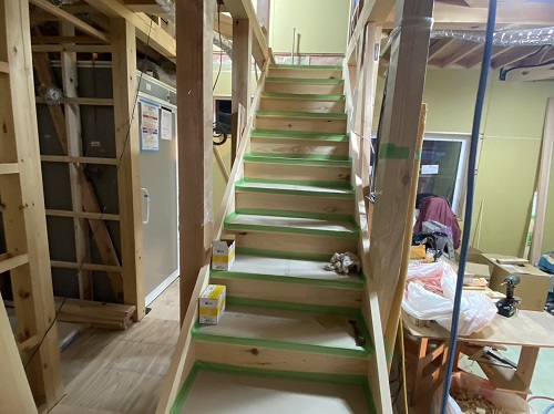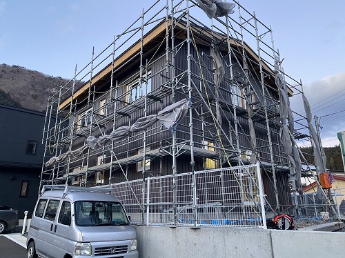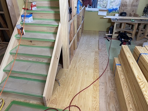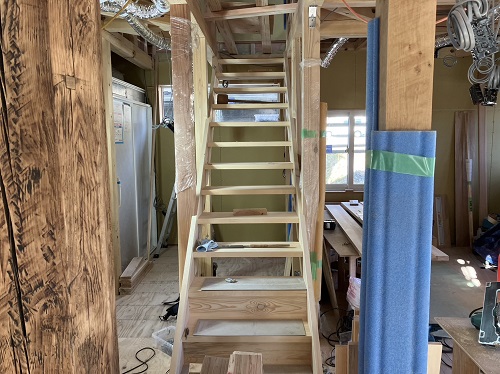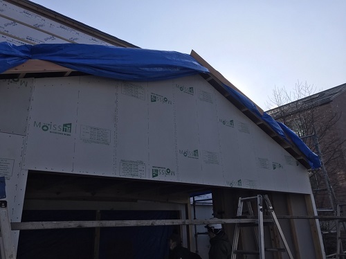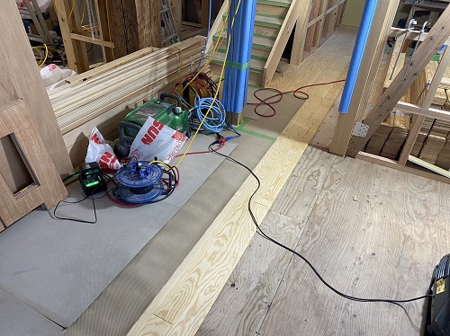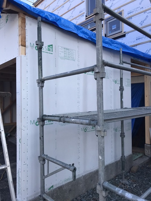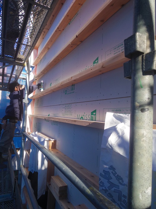 外壁工事が1面の腰で進み内部は1階の床張りが進みました。