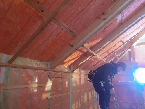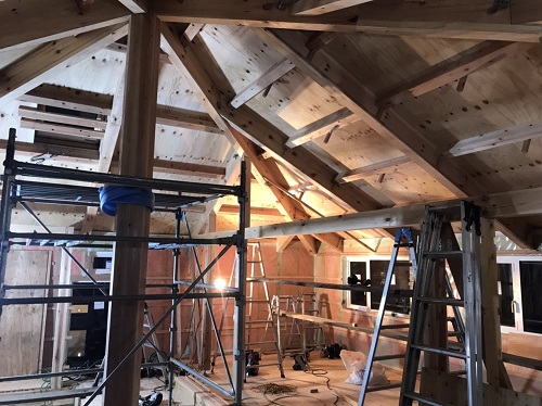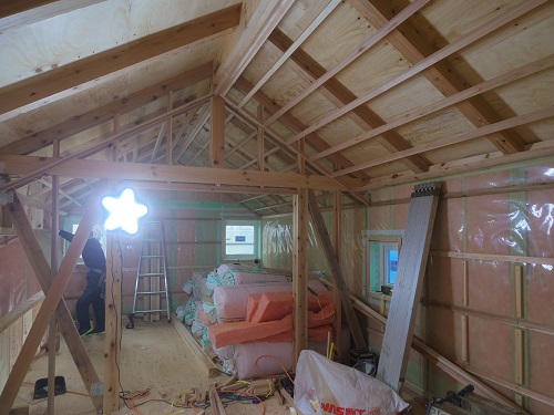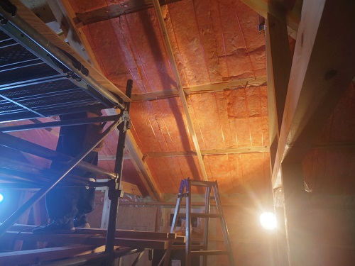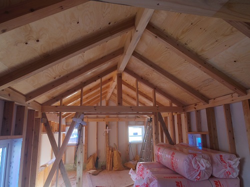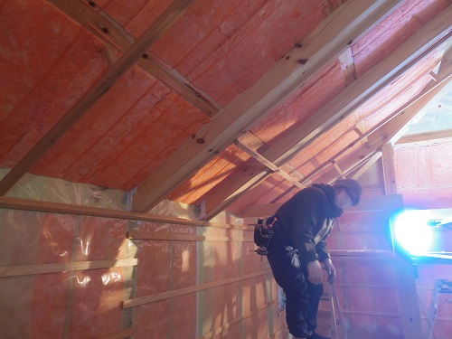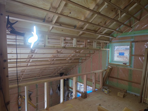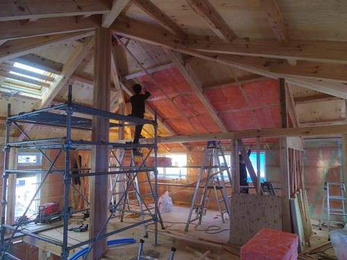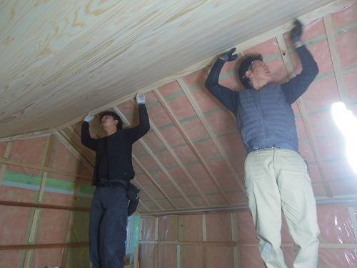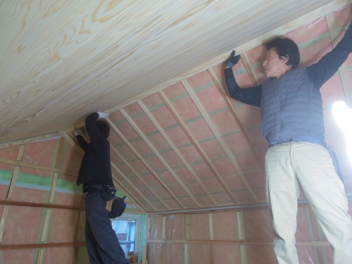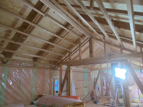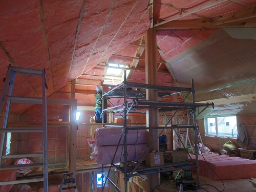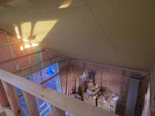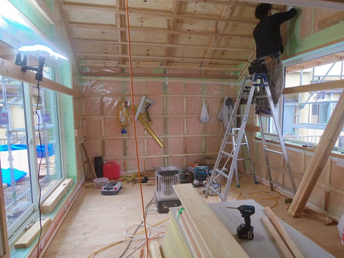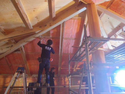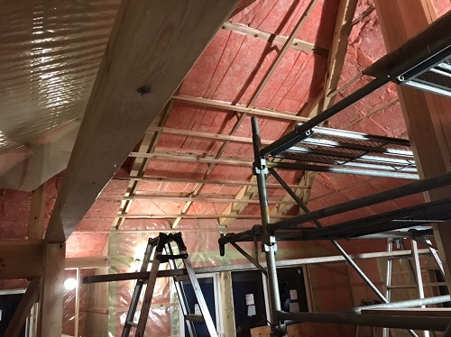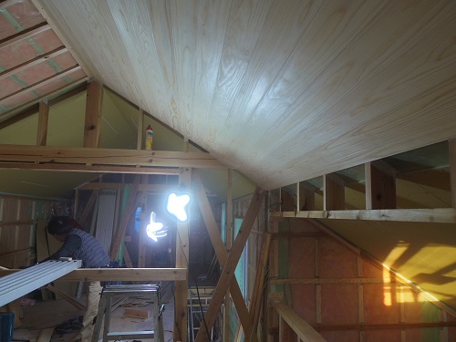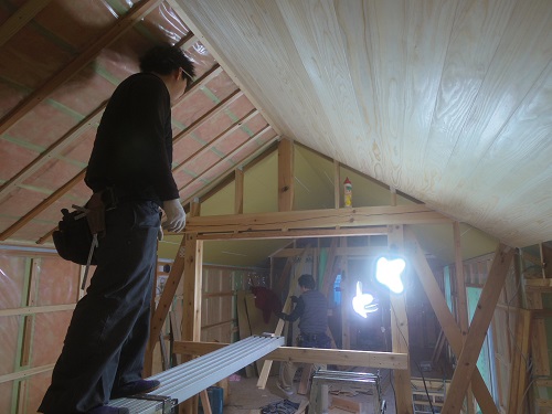 屋根断熱が完了して、その足場を利用しての斜め天井板張り及びPB張が進められています。