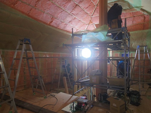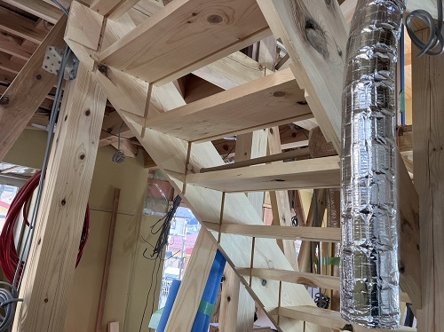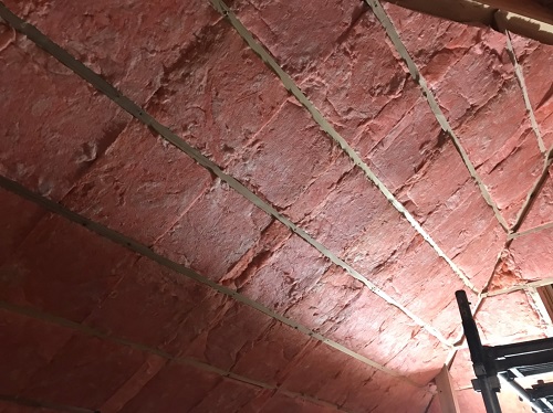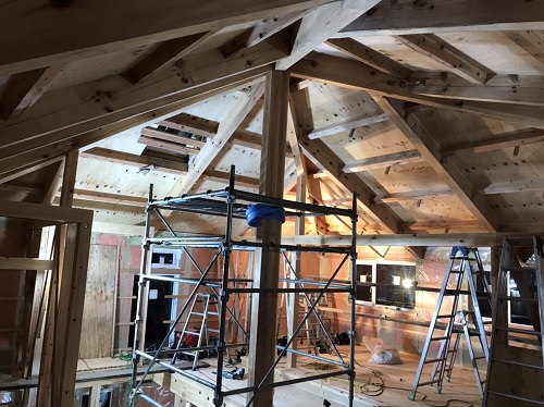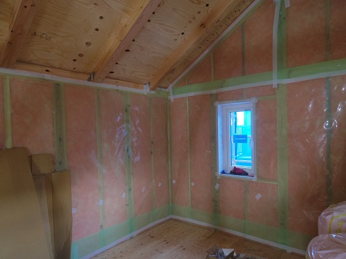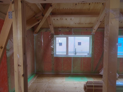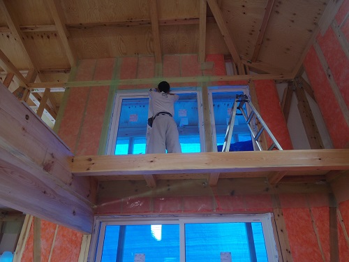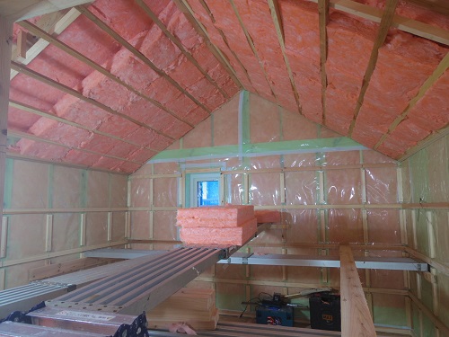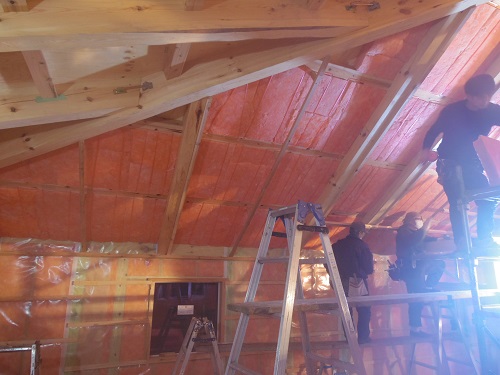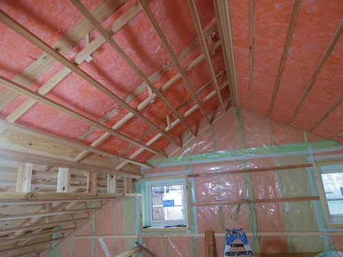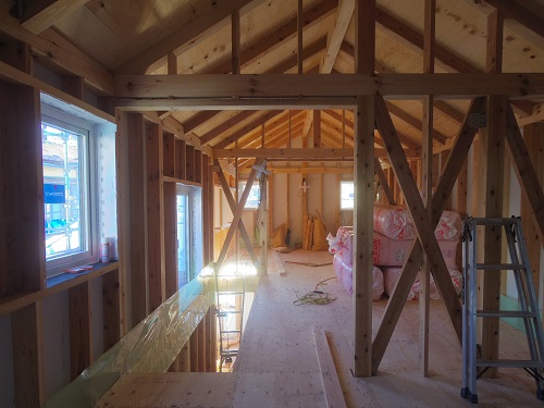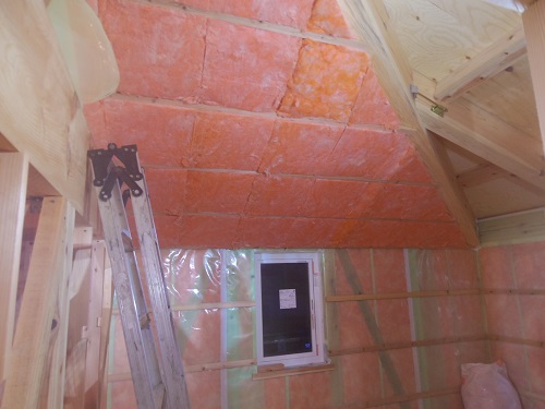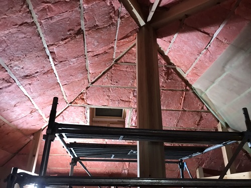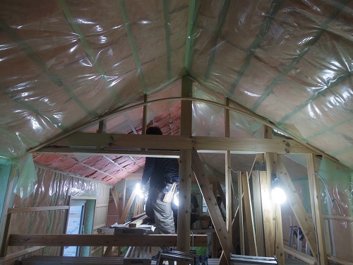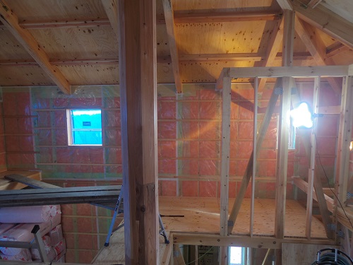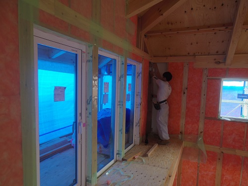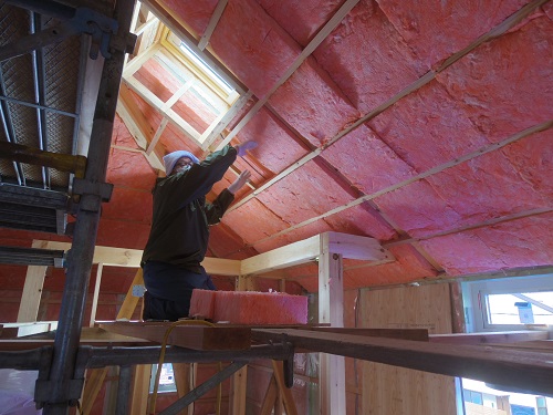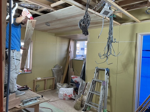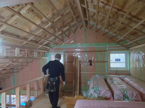 屋根断熱が完了して、その足場を利用しての斜め天井板張り及びPB張が進められています。