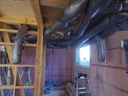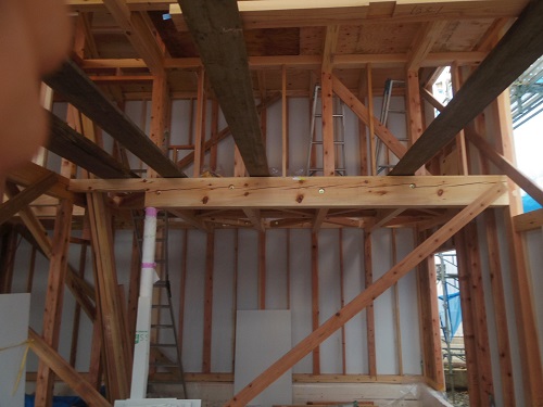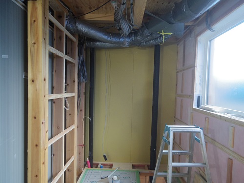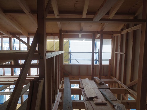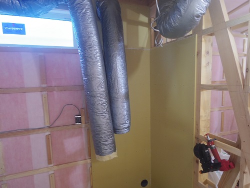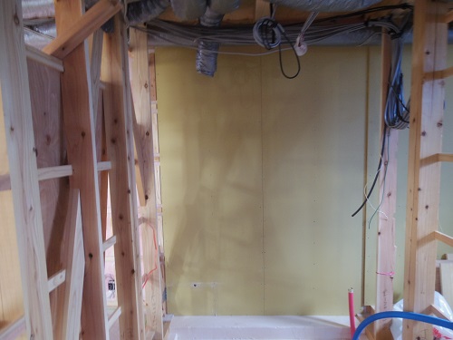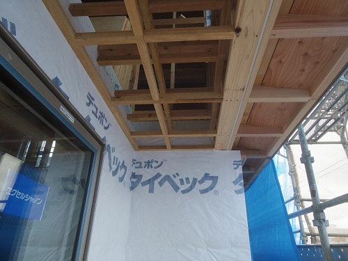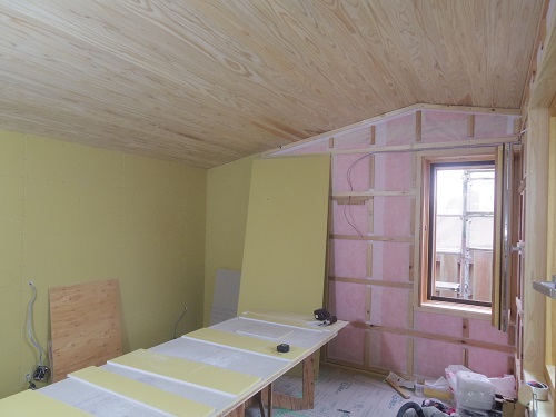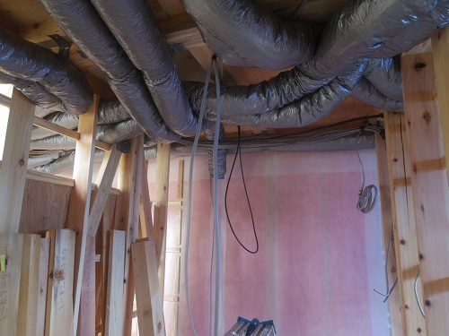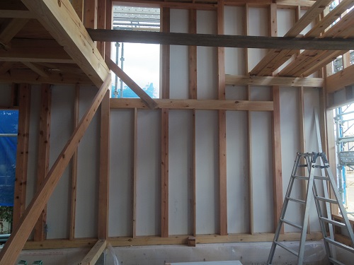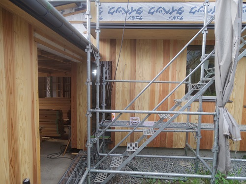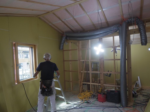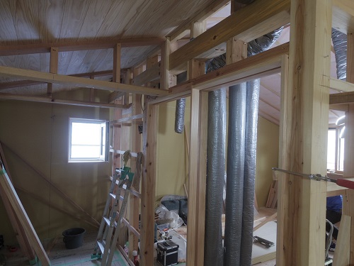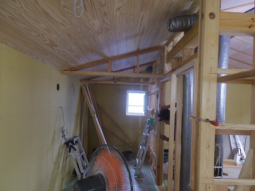 換気配管が完了して内部天井も外壁張りも進んでいます。