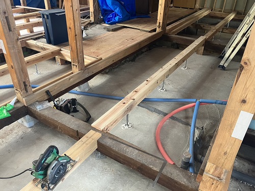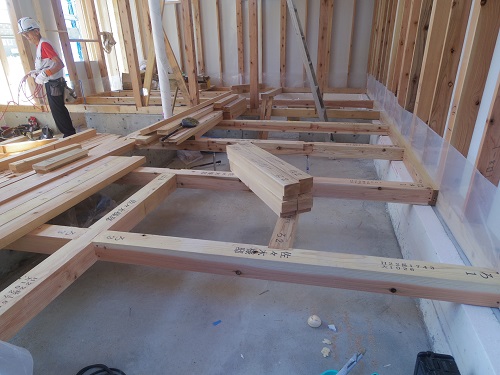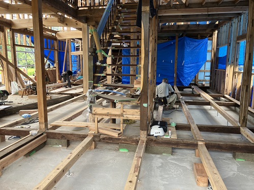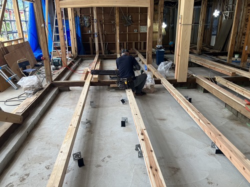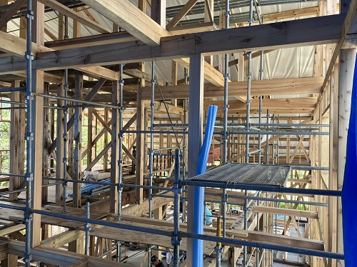床組みと外部間柱工事が進みました。