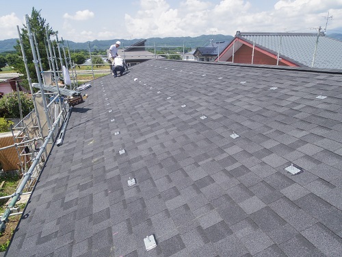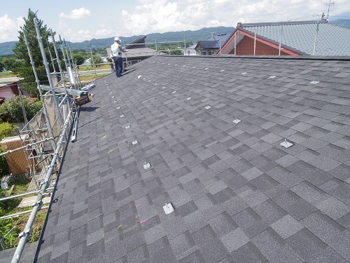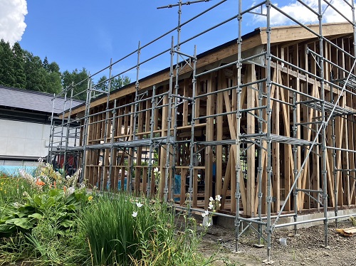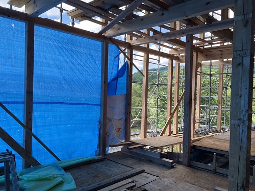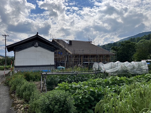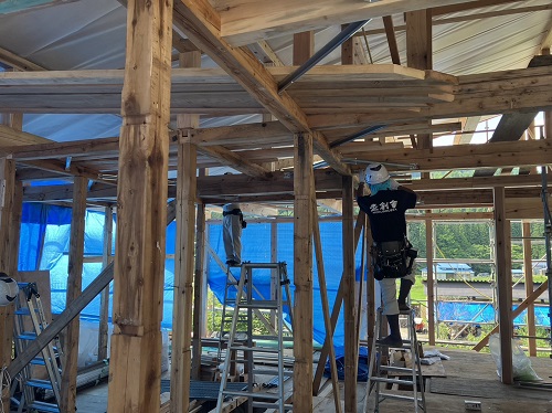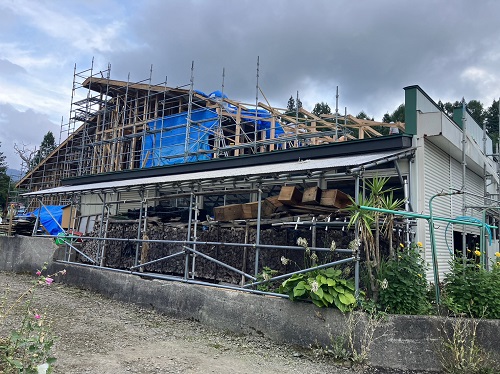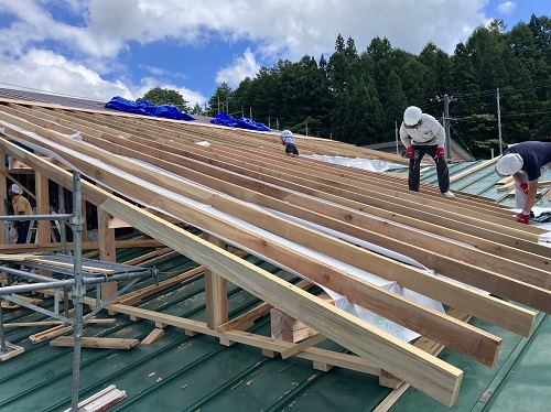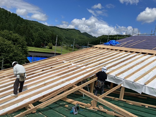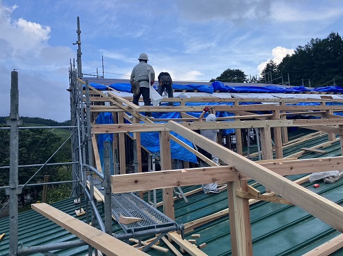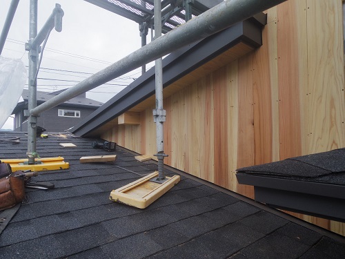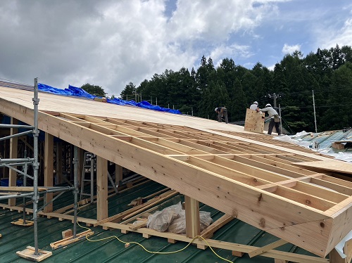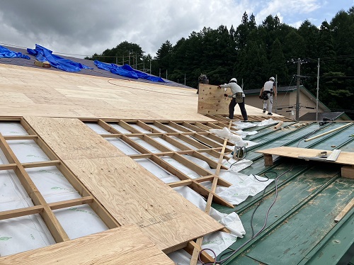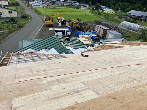 お盆休み前には、既存住宅側上部の屋根工事を進めて台風に備えました。