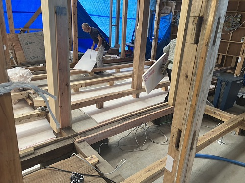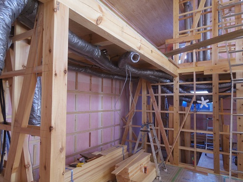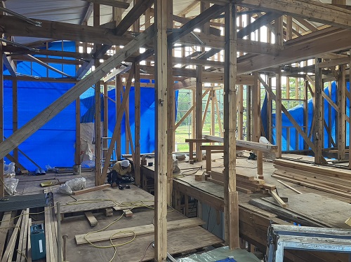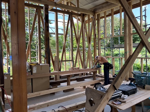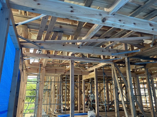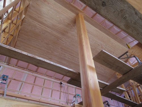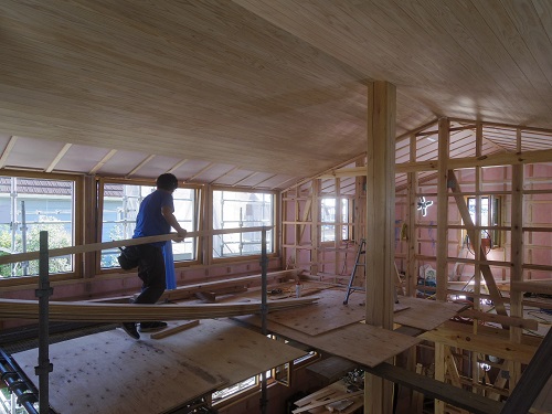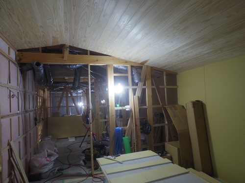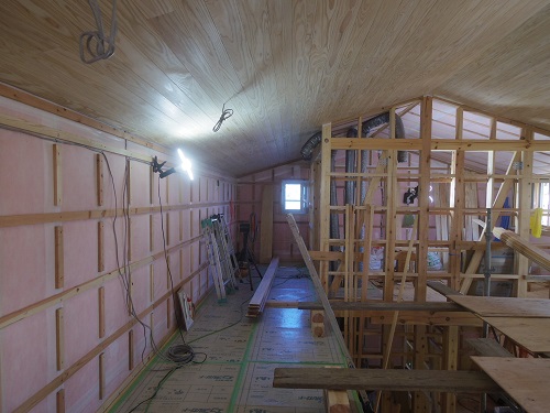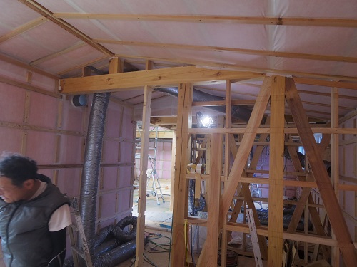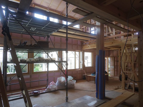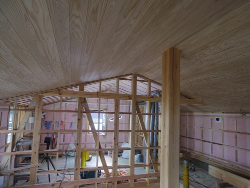 太陽光発電パネルの設置準備と内部天井板張込みが進みました。