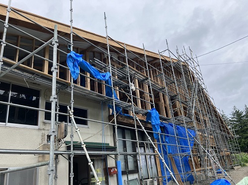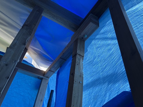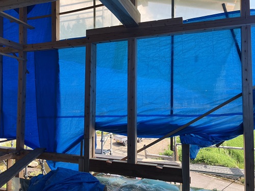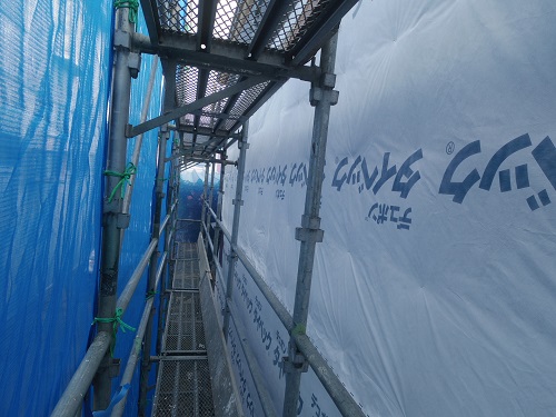 長期休暇中に台風上陸に備えて足場ネットをまとめ、養生シートを張ってくれています。