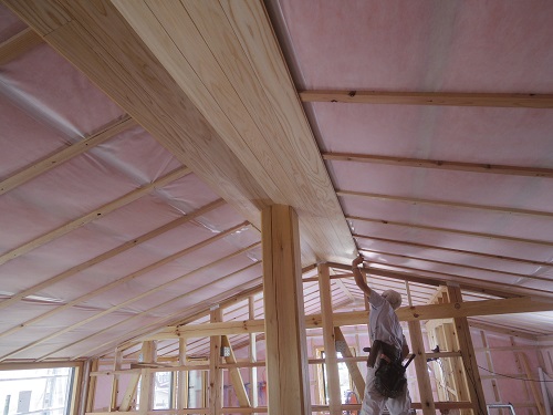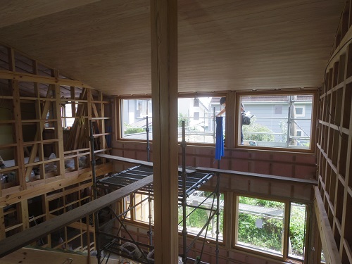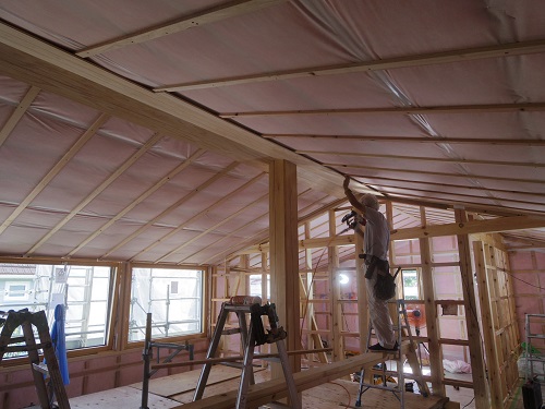 外壁工事と内部天井板張りが始まりました。