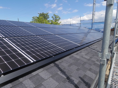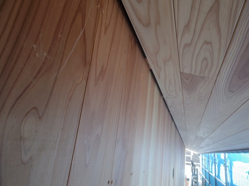 太陽光発電パネルの設置も進み、内部天井板と外部板張りも進みました。