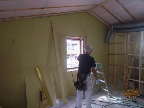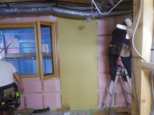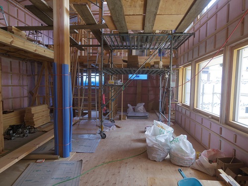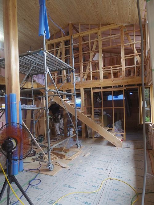 外壁は若手大工のみで頑張っていますが、もう一息ですね。内部はPBの張込みが大分出来てきましたが、こちらももう一息です。