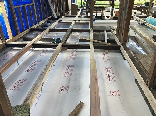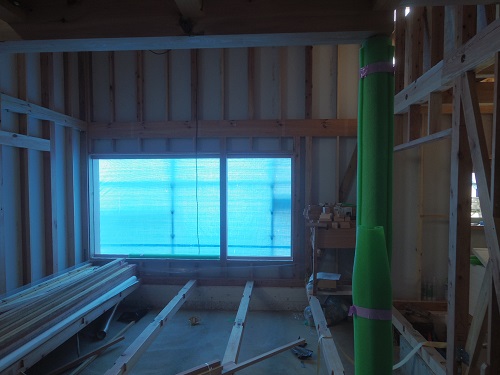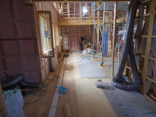 外部は開口部水切り板金が出来たので外壁工事を進める事が出来ます。内部では換気配管も完了して床の敷き込みも進みました。