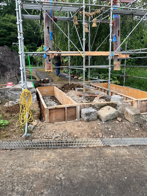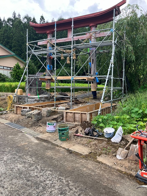 土間断熱大方にて、本日から温水パネルヒータ暖房の配管予定です。これで、田山のような寒い所でも水落とし無しでも大丈夫になりますね。鳥居の補強基礎も打設準備完了です。