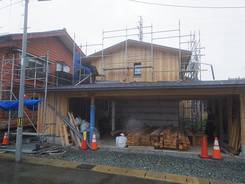外壁は板のジョイントに桟打ちが進み、内部PB張込みも進んではいますがもう一頑張りです。