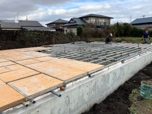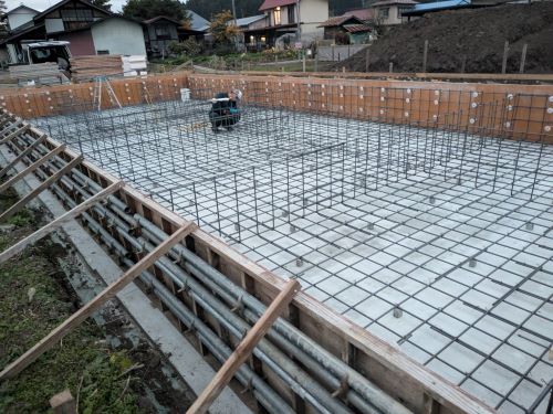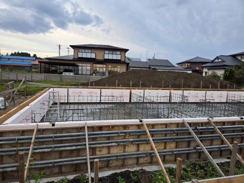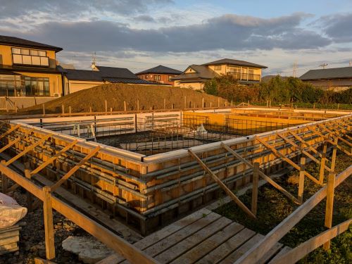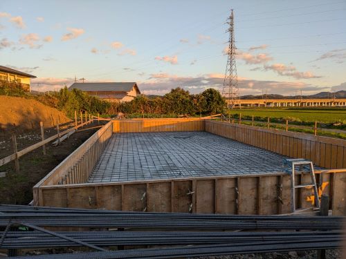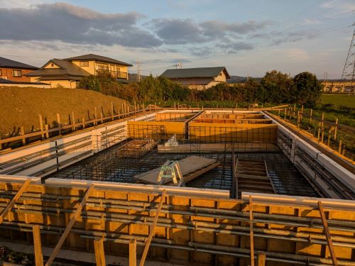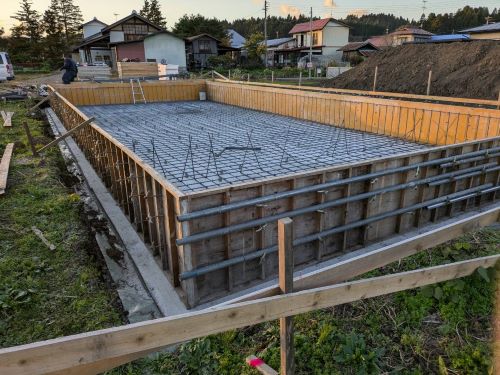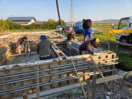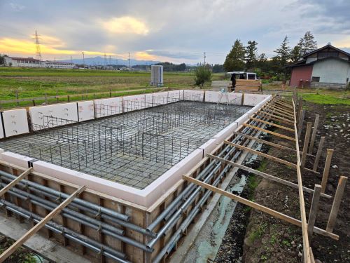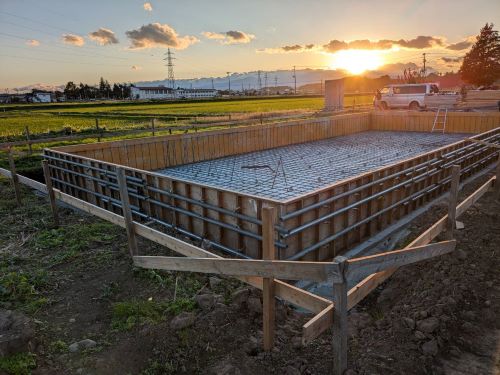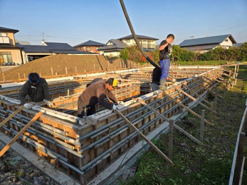 基礎コンクリート無事打設しました。暖かい日で天候に恵まれました。