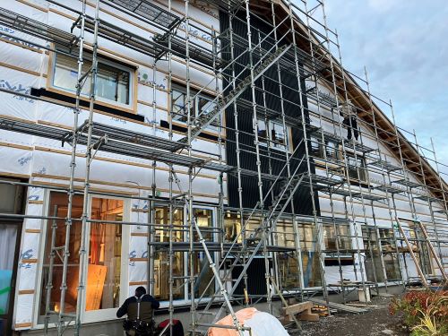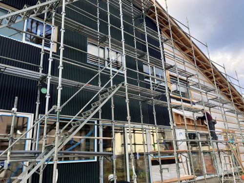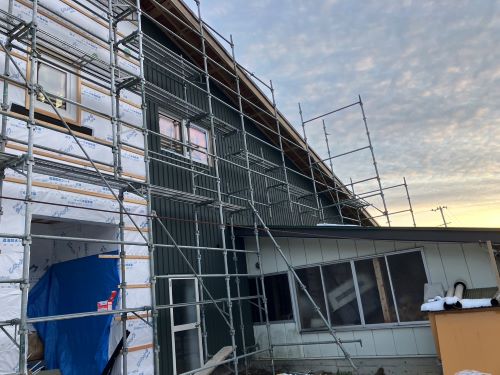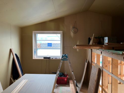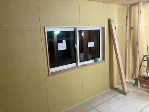 2階床は張り上げて1階天井板も張り上げてPB張り込みが進みます。1階ではPB張り前の窓枠の取り付けや敷居鴨居の取り付けが取り組まれています。外壁工事は板金屋さんが都から来ているので、休み休みで少しづつ進みました。