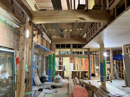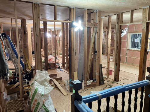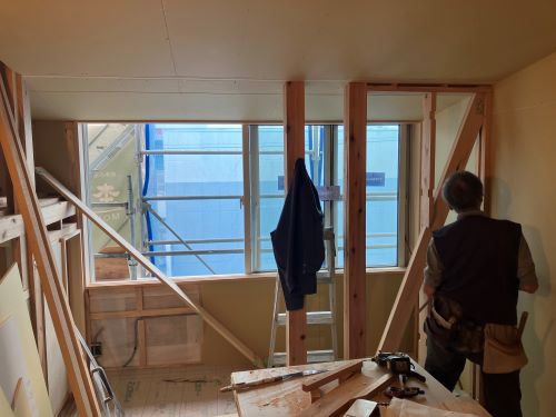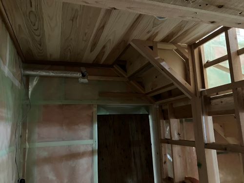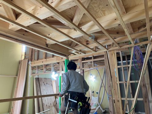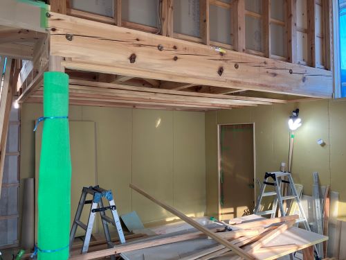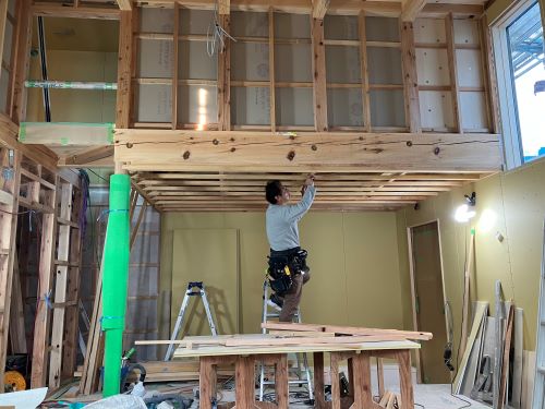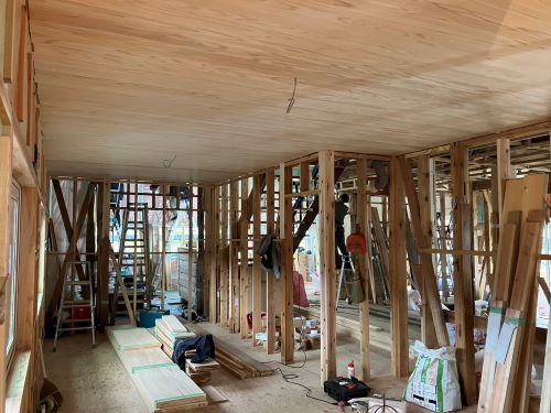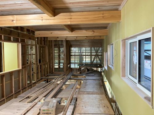 間仕切り下地が進み、2階の天井板張りも大方です。