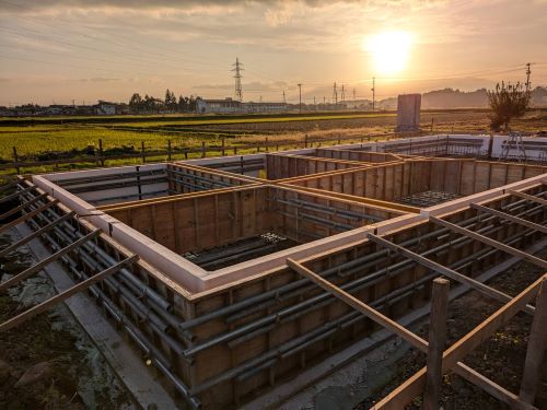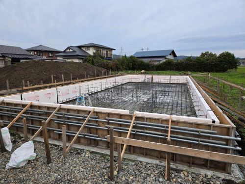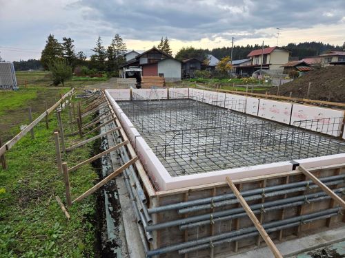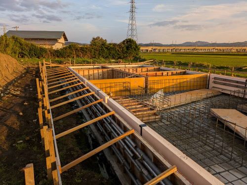 配筋検査無事合格しましたので、断熱枠の取り付けを進めます。