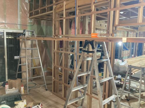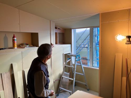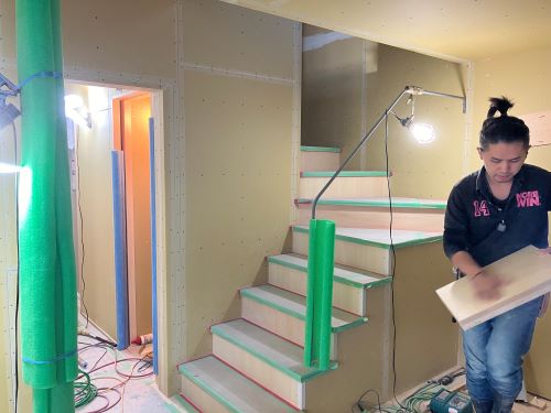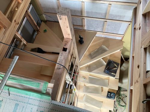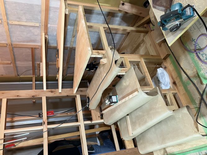 ボード張りが懸命に取り組まれています。階段は周り部が出来てきました。