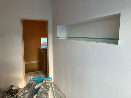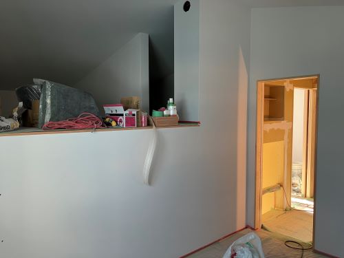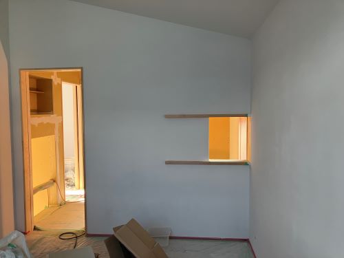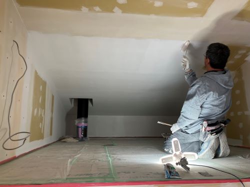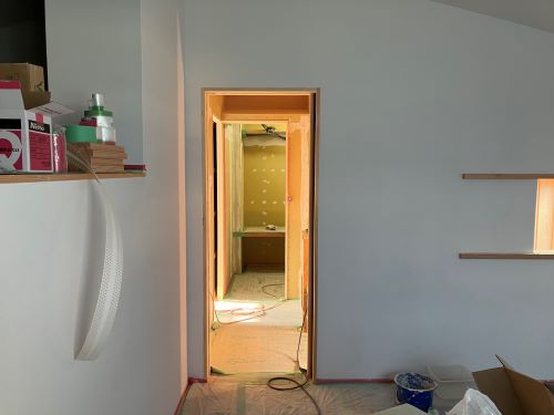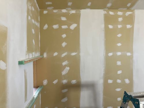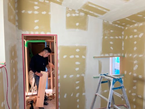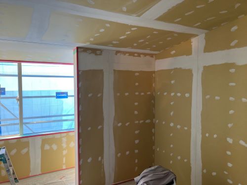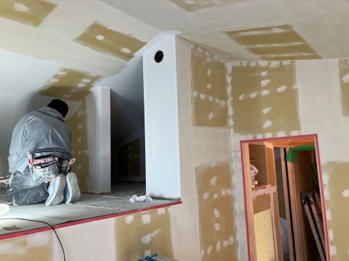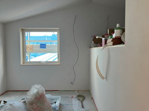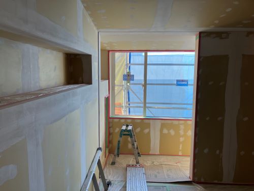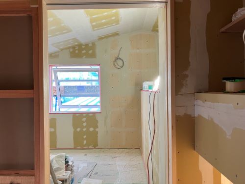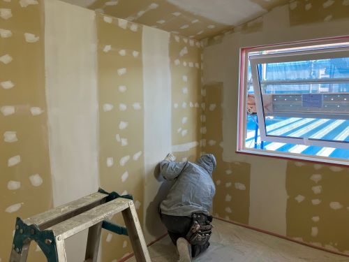 大工工事は洗面化粧台など造作中ですが、内装のパテ打ちが始まりました。