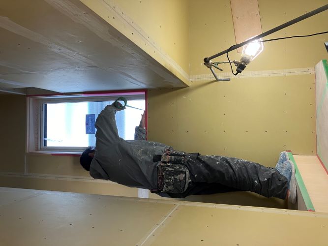 1階の大工王作頑張っています。2階の内装も進んでパテ打ちに降りてきました。