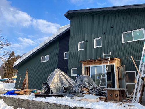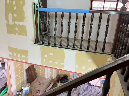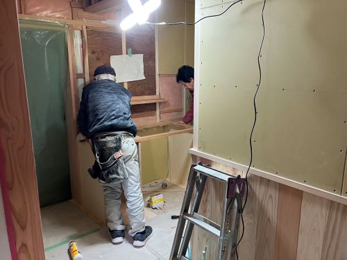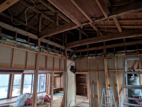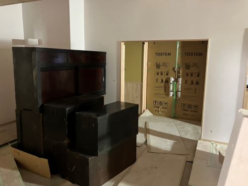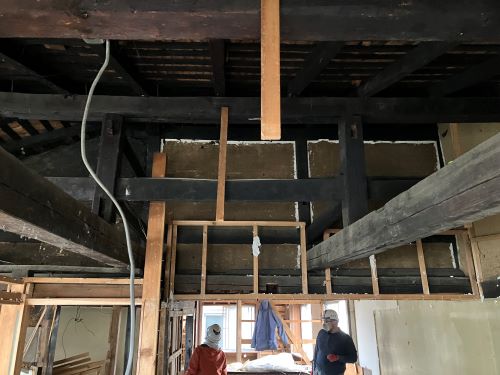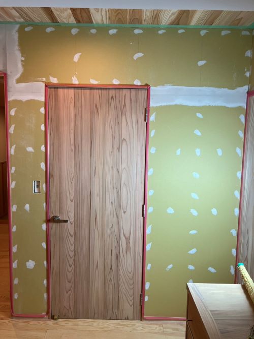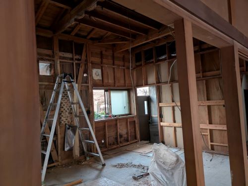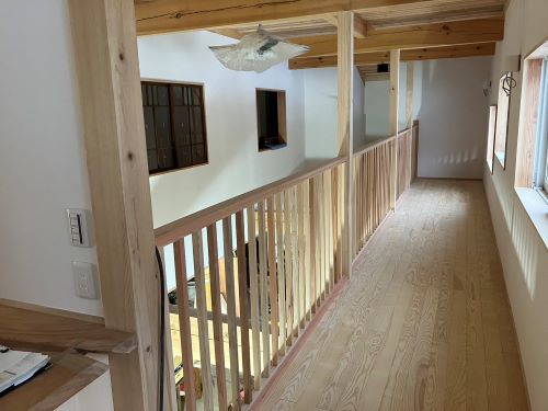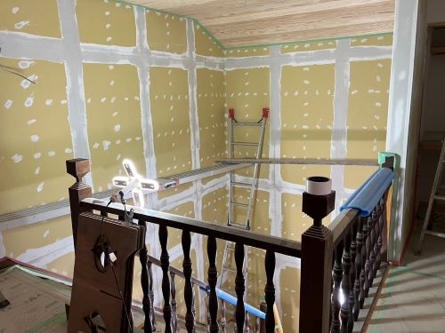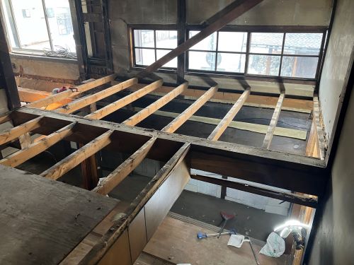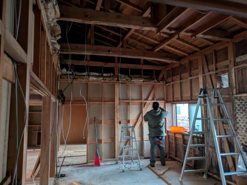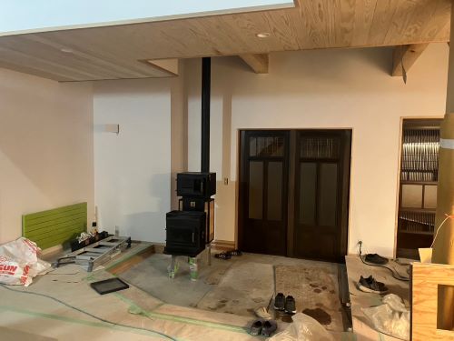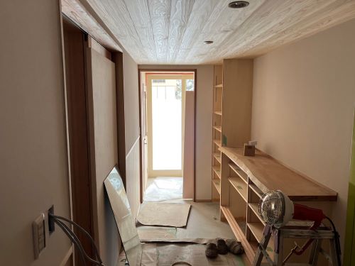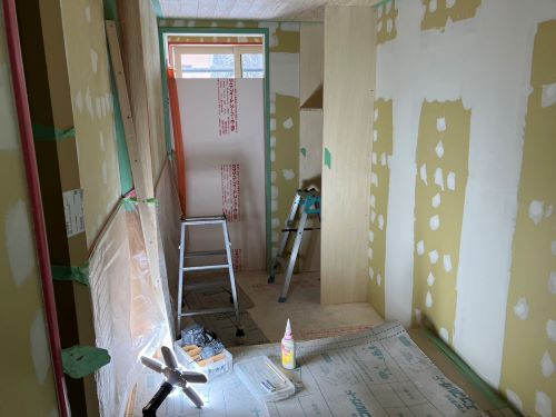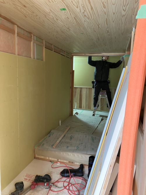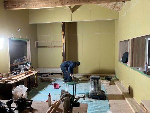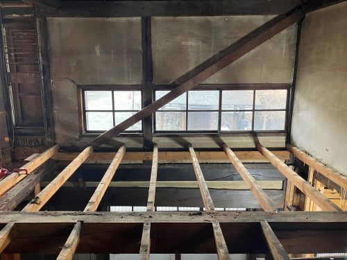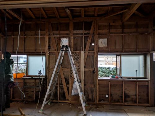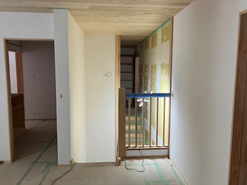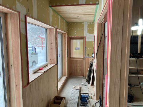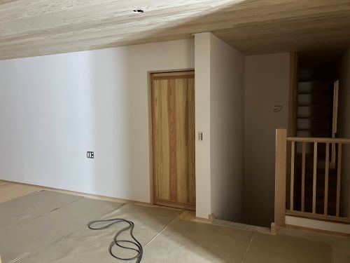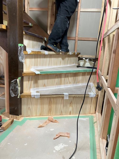 ボードの張り残しももう少しで完了です。既存階段の修理補強も進みました。建具工事も始まりました。